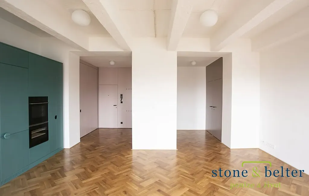 Byt je k pronájmu bez vybavení – zůstává vestavné vybavení a prvky na míru.