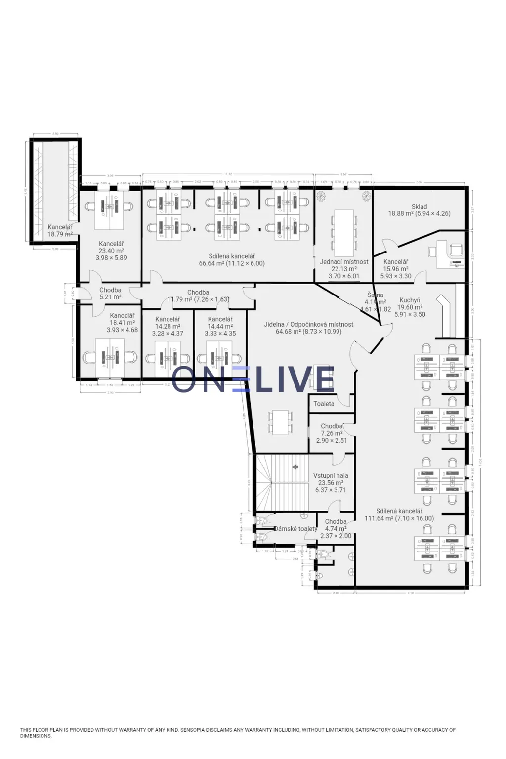 Prostory se nachází v nejvyšším patře budovy, jsou klimatizované a jsou členěny do několika samostatných kanceláří, dvou velkorysých sdílených open space prostorů, zasedací místnosti, kuchyňky, jídelny/odpočinkové zóny a skladu.