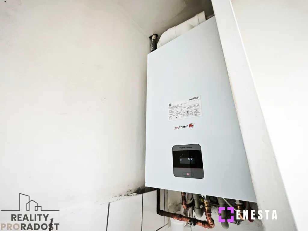- Vytápění a ohřev vody zajišťuje nový úsporný plynový kondenzační kotel, který zaručuje efektivní provozní náklady.