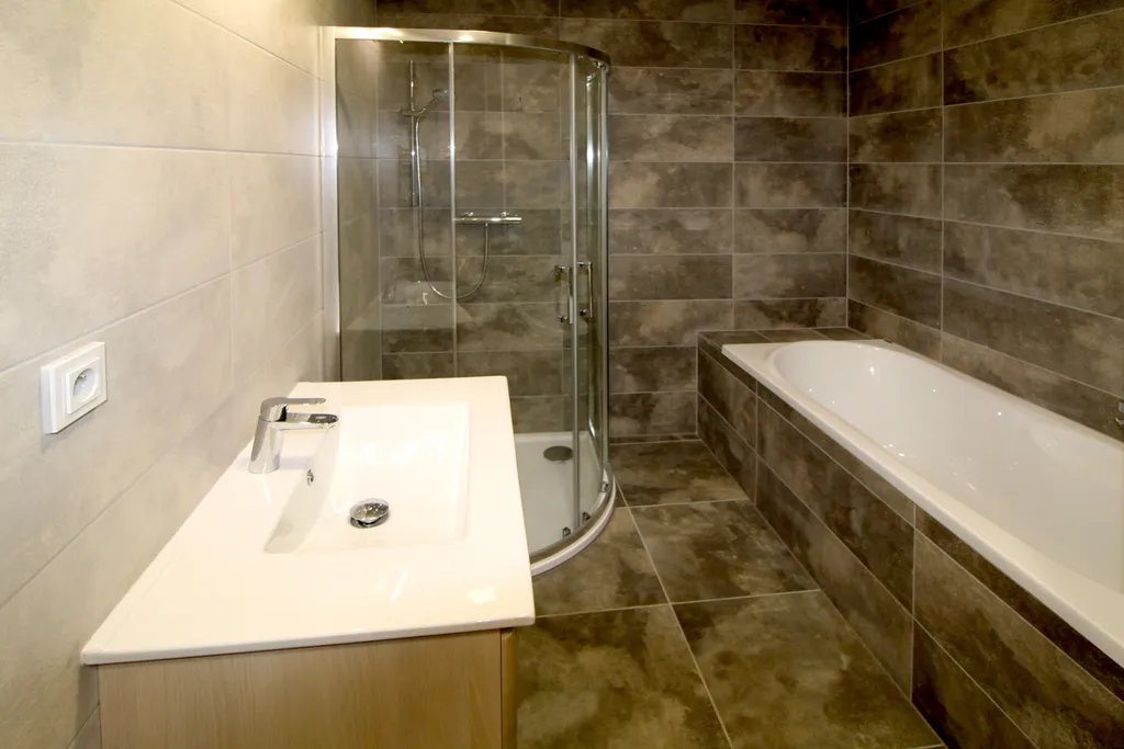 Prostorná koupelna se sprchovým koutem, umyvadlem a toaletou nabízí také místo pro pračku i sušičku.