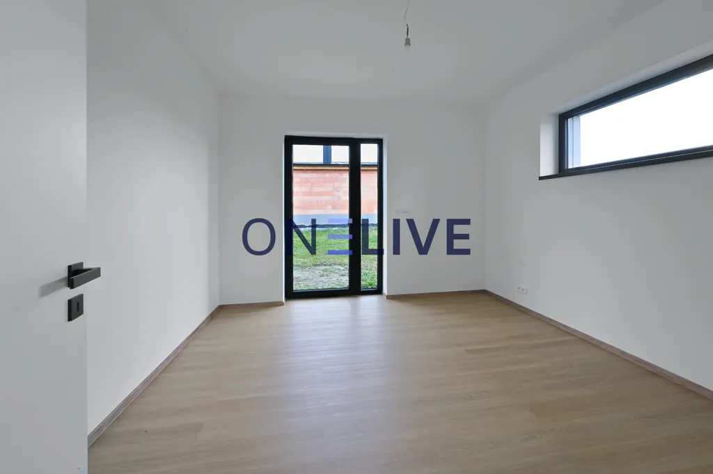Dominantou domu je světlý obývací pokoj propojený s kuchyní a jídelní částí, odkud je přímý vstup na zahradu. Ze všech obytných místností – ložnice i dvou dětských pokojů – lze vyjít přímo ven, což dodává domu vzdušnost a propojuje interiér s exteriérem. Dále se v domě nachází vstupní chodba, která je prostorná a prakticky řešená, koupelna s vanou, sprchovým koutem a samostatná toaleta. K dispozici je také technická místnost s místem pro pračku a sušičku.