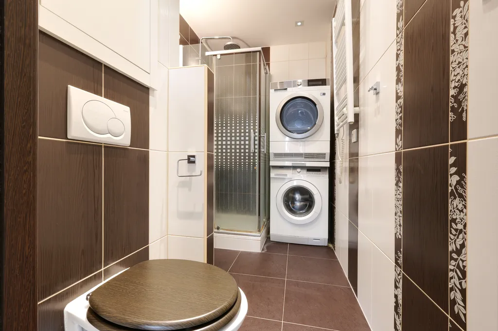 Koupelna je spojena s WC a vybavena sprchovým koutem, pračkou, sušičkou, topným žebříkem, umyvadlem s umyvadlovou skříňkou a zrcadlovou skříňkou. WC je závěsné.