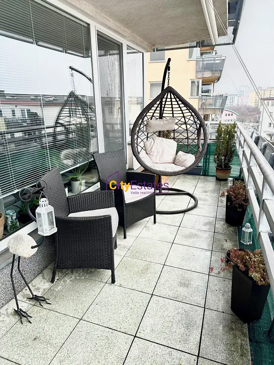 Samotný byt má plochu 99 m2, terasa 10 m2, zasklený balkon 2 m2, sklep 3 m2. Byt je umístěn ve 3. patře cihlového bezbariérového domu s výtahem. Dispozice bytu je velmi dobře řešená. Byt je orientovaný na tři světové strany, z velkého obývacího pokoje s kuchyní vejdete přímo na jižní terasu, tři neprůchozí pokoje jsou orientovány na sever. Jeden pokoj a obývák mají atypické rohové okno. U pracovny je umístěn zasklený balkón. V prostorné koupelně je okno a je zde umístěna rohová vana. WC je samostatné. V bytě je také velmi praktická komora s úložným prostorem. V suterénu domu je zabezpečený sklep a garážové stání.