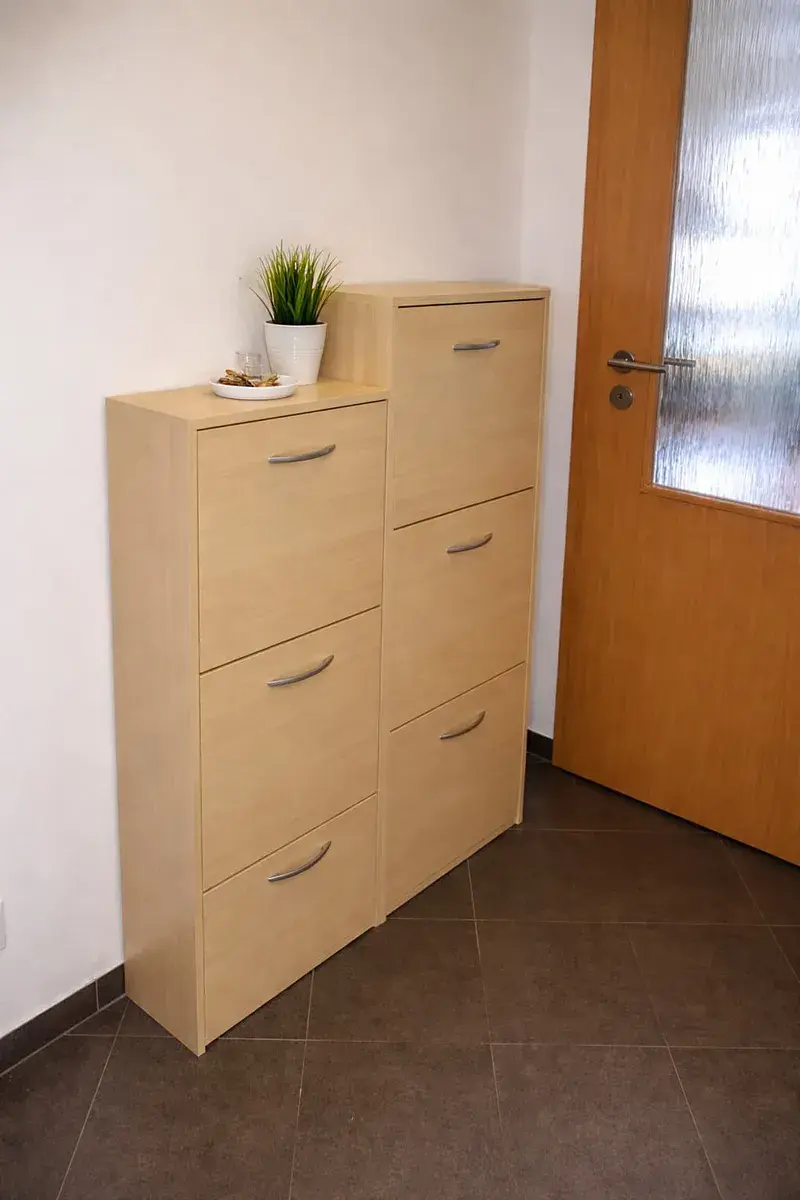 V předsíni velká vestavěná skříň (3dveřová, 1x zrcadlo), věšák a botník.