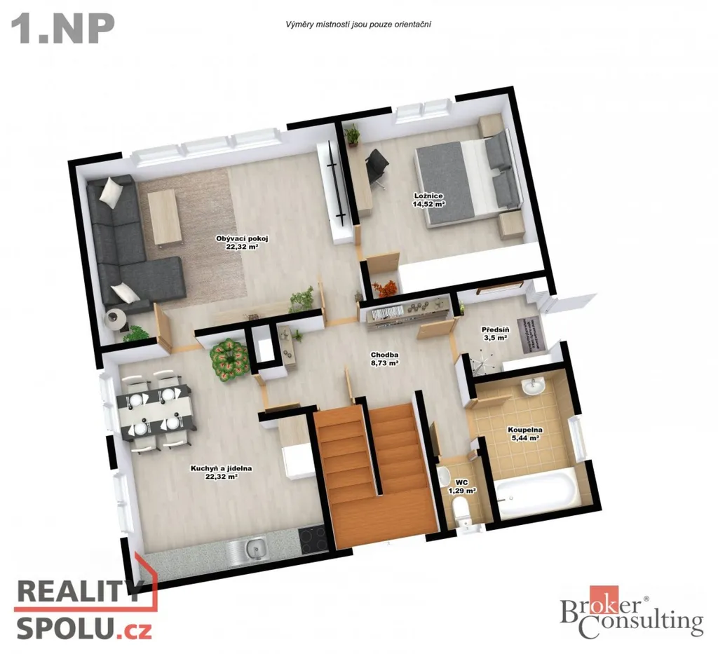 V 1. NP vás přivítá vstupní předsíň a chodba, navazuje kuchyň, obývací pokoj, ložnici, koupelna a samostatné WC, tedy plnohodnotné a komfortní bydlení.