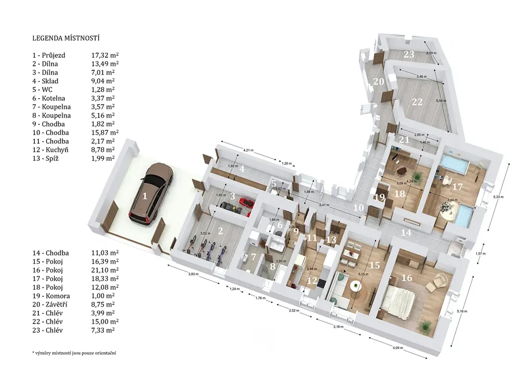 průjezd - 17,32 m², dílna - 13,49 m², dílna - 7,01 m², sklad - 9,04 m², WC - 1,28 m², kotelna - 3,37 m², koupelna - 3,57 m², koupelna - 5,16 m², chodba - 1,82 m², chodba - 15,87 m², chodba - 2,17 m², kuchyň - 8,78 m², spíž - 1,99 m², chodba - 11,03 m², pokoj - 16,39 m², pokoj - 21,10 m², pokoj - 18,33 m², pokoj - 12,08 m², komora - 1,00 m², závětří - 8,75 m², chlév - 3,99 m², chlév - 15 m², chlév - 7,33 m², dřevník - 19,07 m², dílna - 8,98 m², garáž - 9,96 m², kurník - 4,25 m².