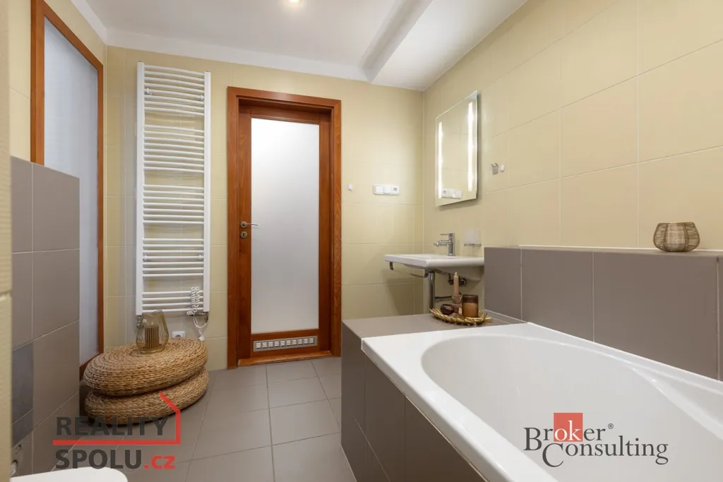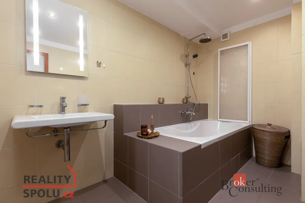 Koupelna s vanou a pračkou je praktická a funkční. Vlastní kondenzační kotel znamená kontrolu nad náklady i nezávislost na centrálním vytápění.