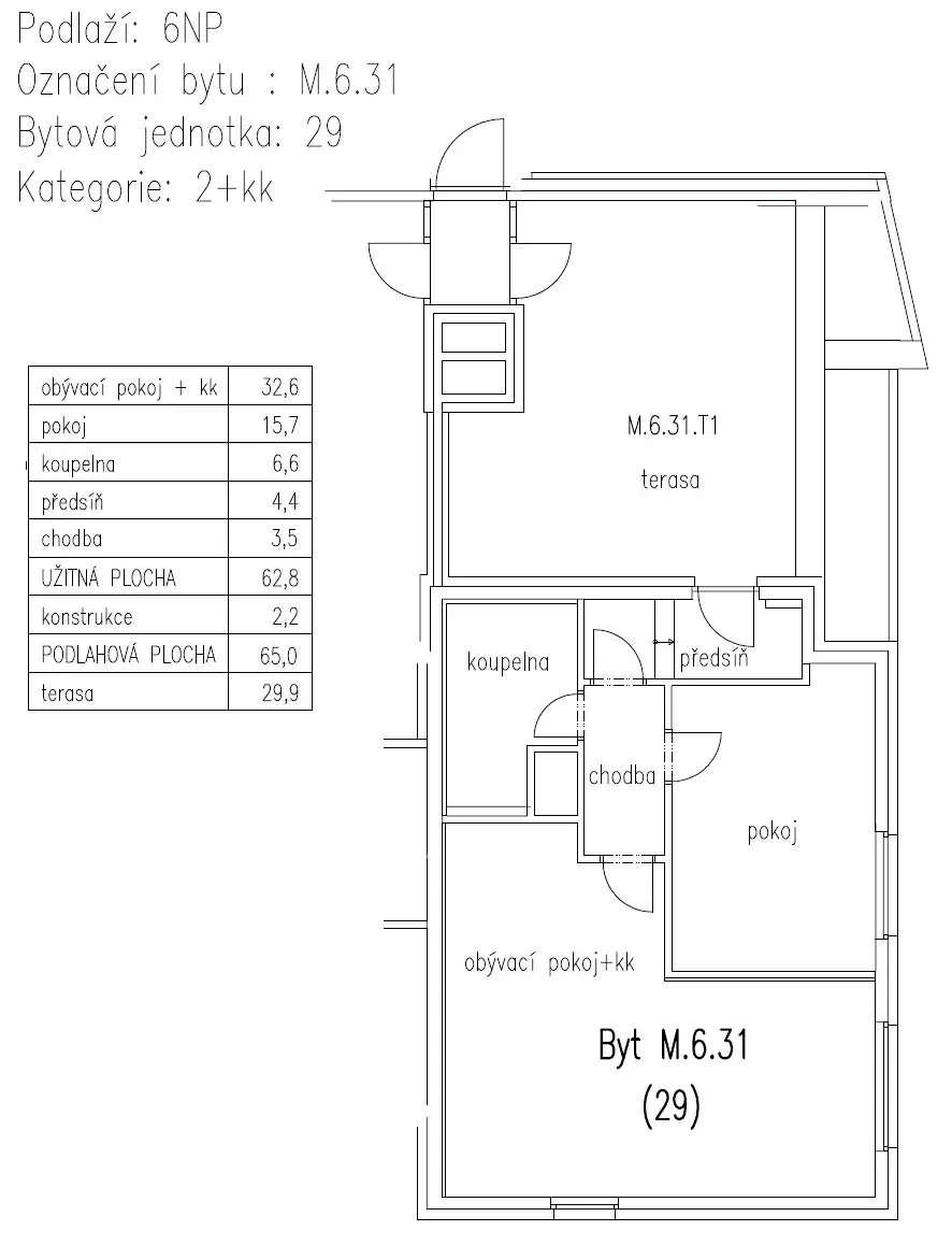 Byt o rozloze 65 m² je umístěn v šestém patře novostavby a disponuje prostornou terasou o ploše 30 m², která nabízí krásný výhled. Denní světlo a svěží vzduch v interiéru jsou tak zajištěny v každé části bytu.