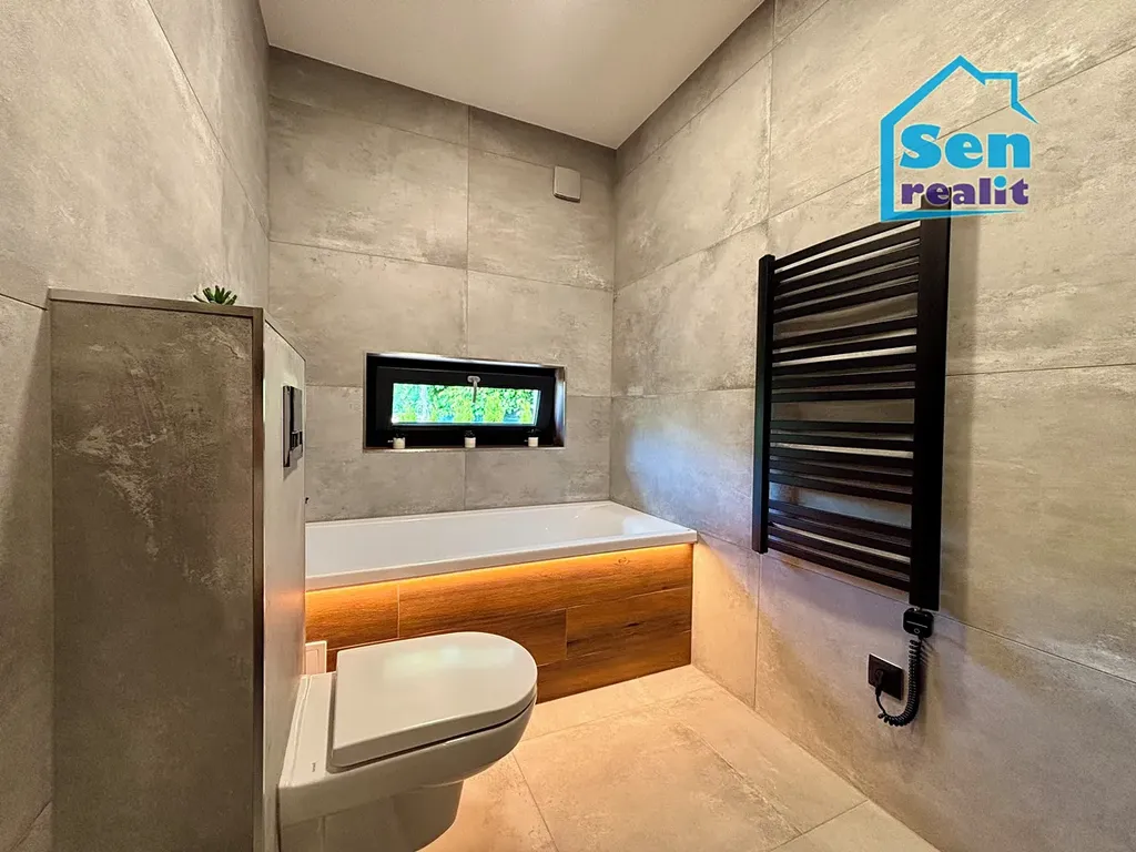 Moderní koupelna se sprchovým koutem, WC a podsvícenou vanou