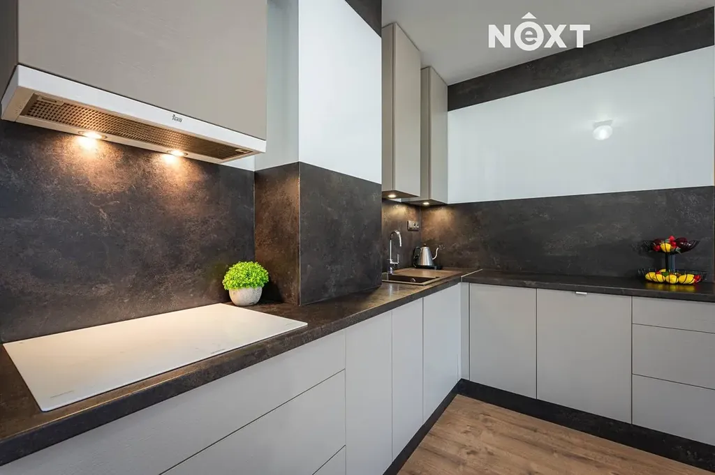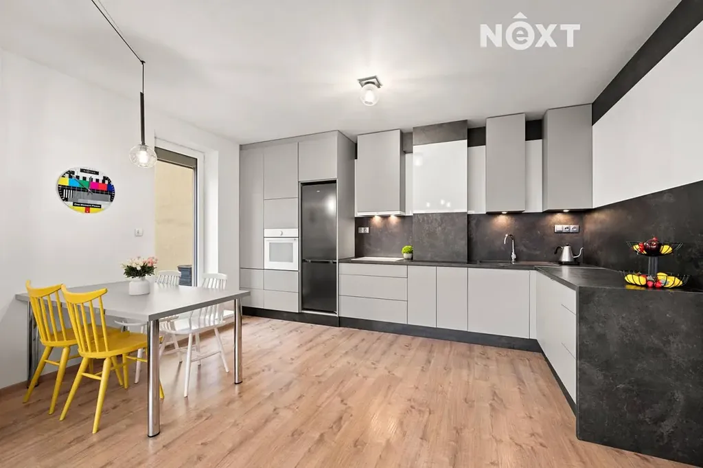 Dominantou bytu je světlý a vzdušný obývací prostor s moderní kuchyní, kde se čistý design potkává s praktičností každodenního života. Velkoformátová okna přivádějí do interiéru dostatek denního světla a plynule propojují byt s jeho největší předností – prostornou terasou o výměře téměř 50 m².