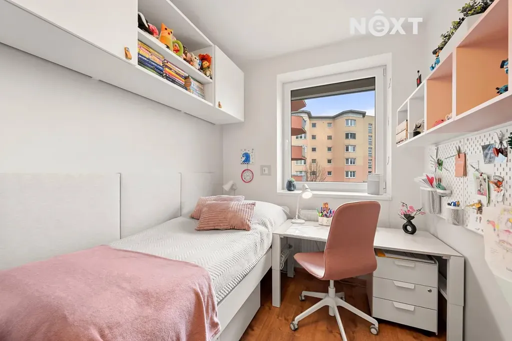 Dispozice bytu zahrnuje ložnici, dětský pokoj, koupelnu s vanou, samostatné WC a vstupní chodbu s prakticky řešeným úložným prostorem. Nábytek je navržen na míru tak, aby maximálně využil každý metr a zároveň zachoval vzdušnost interiéru.