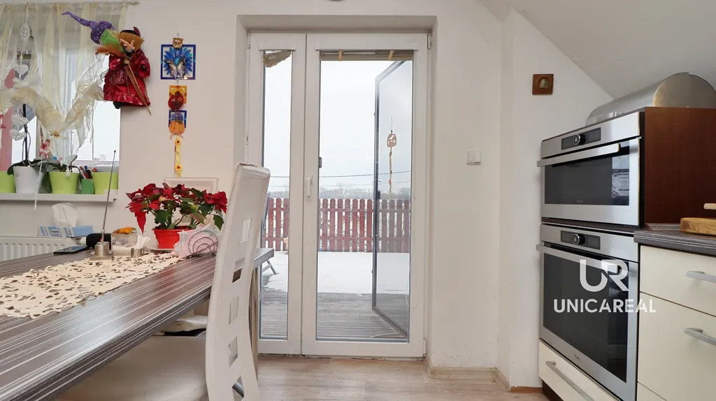 Dominantní místností celého bytu je obývací pokoj s kuchyňským koutem 31 m². Kuchyňská část je zařízena vkusně zvolenou kuchyňskou linkou s vestavěnými spotřebiči ( varná deska, digestoř, trouba, myčka, mikrovlnná trouba) lednicí a jídelním stolem se židlemi. Z obývací části je přímý vstup na prostornou terasu 24 m² s možností posezení a relaxování.