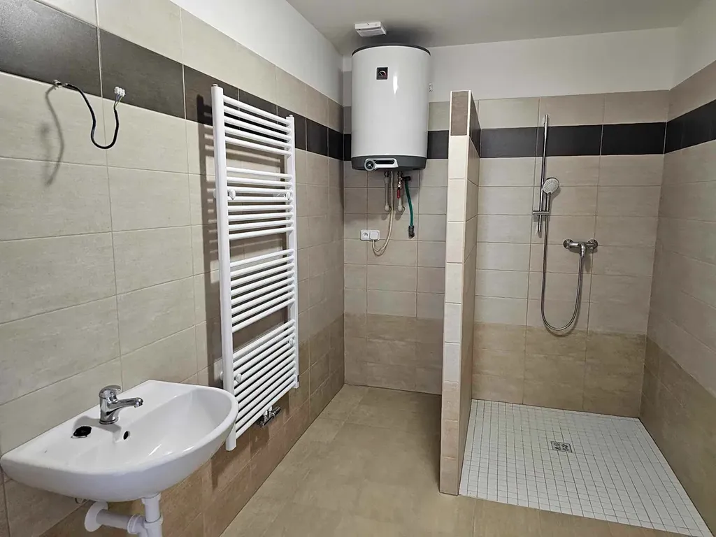 Vybavení bytu: kuchyňská linka, sprchový kout, WC, otopný žebřík, topení podlahové (tepelné čerpadlo), každý byt má termostat s nastavitelnou teplotou, měřák na teplo, okna plastová, podlaha plovoucí a dlažba. V domě domovní telefon, společná anténa na TV, společný dvůr s možností využití na posezení a společná kolárna.