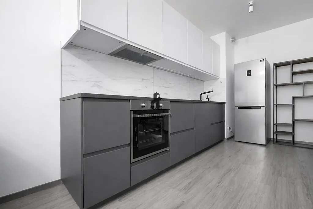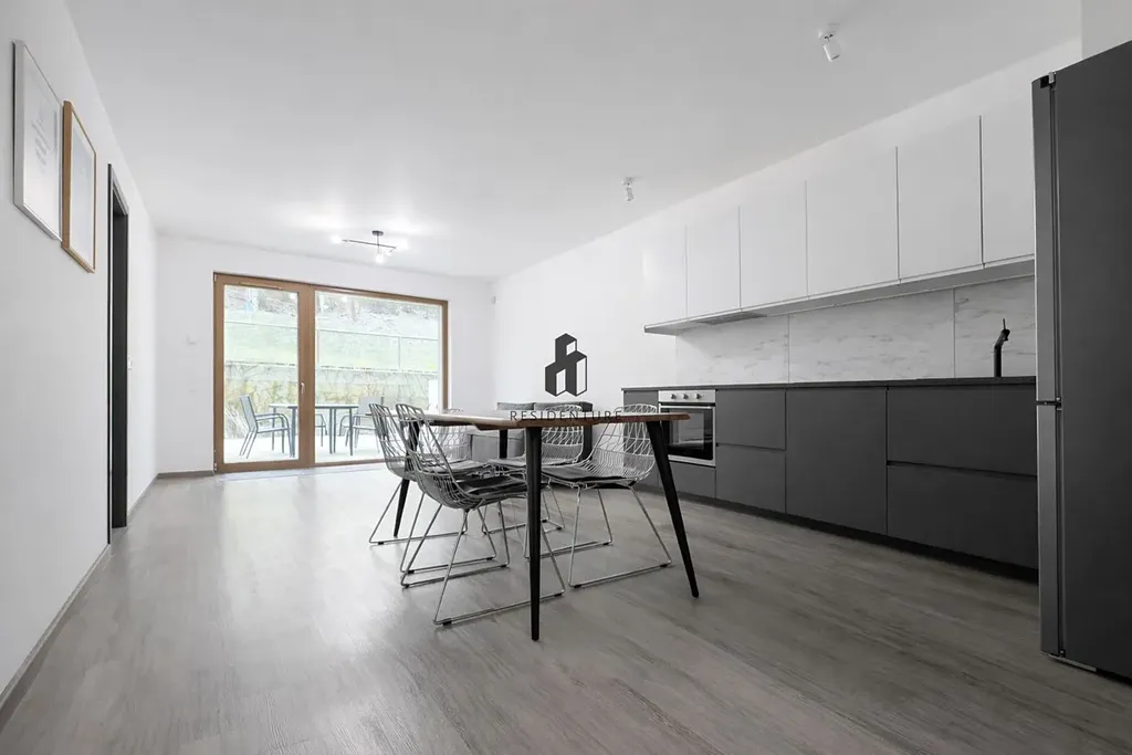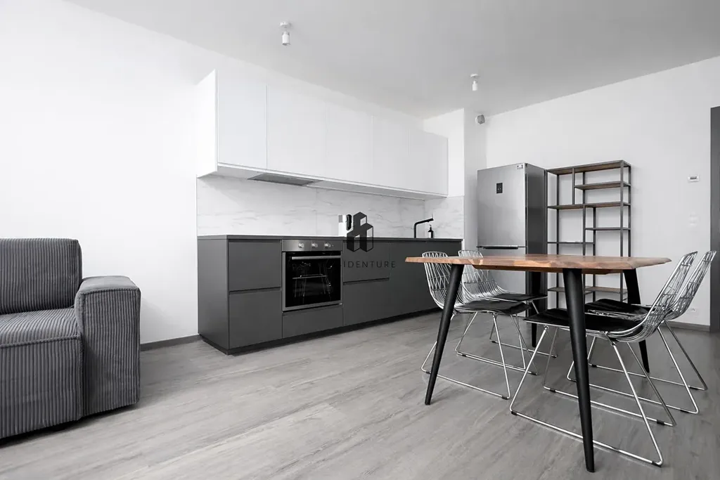Byt je kompletně vybaven – moderní kuchyňská linka zahrnuje varnou desku, troubu, myčku, digestoř a vestavěnou lednici. Součástí vybavení je také jídelní stůl a sedací souprava.