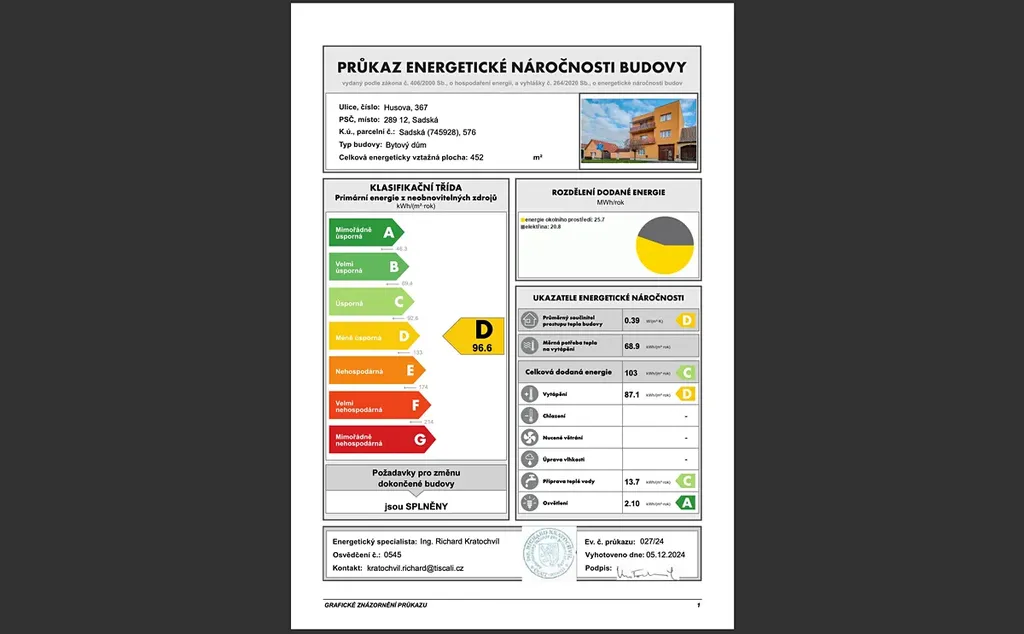 Dům je vytápěn tepelným čerpadlem, fasáda je zateplena a všechny okna i dveře jsou plastová. Dům je tak Energicky nenáročný. PENB je v přípravě, proto je dočasně vyznačena třída G.