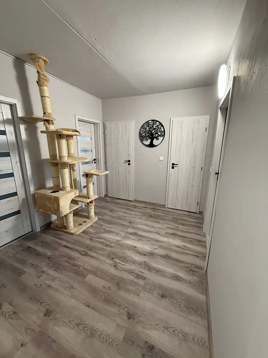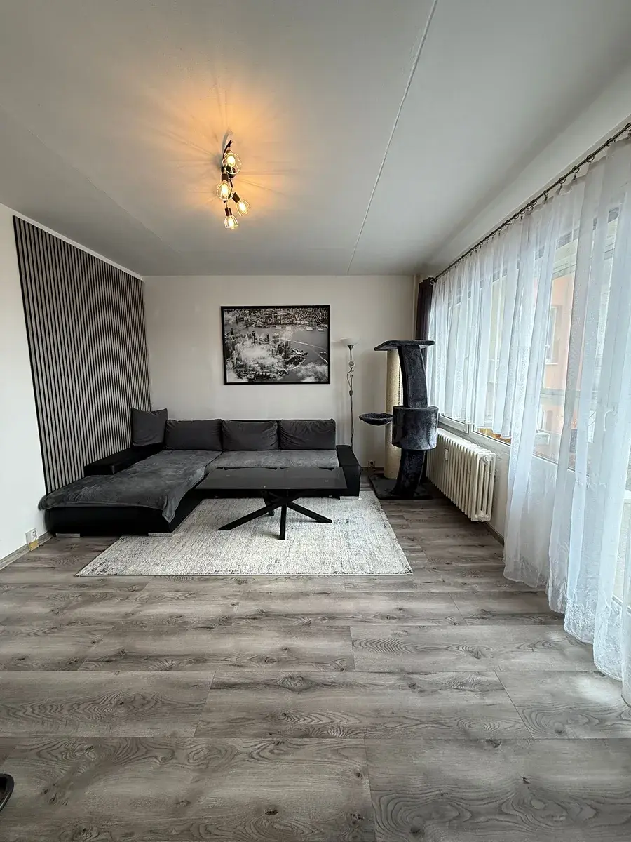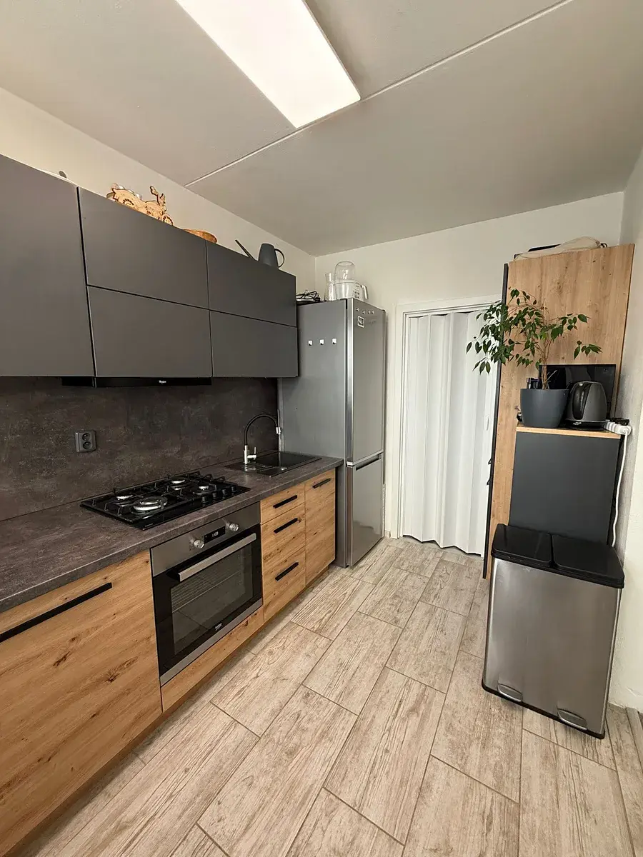 Byt prošel zdařilou rekonstrukcí – nová moderní rohová kuchyně, podlahy, interiérové dveře, koupelna se sprchovým koutem a samostatná toaleta.