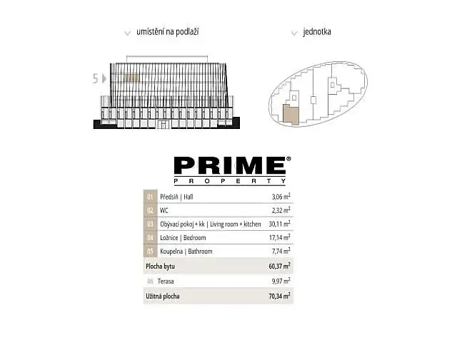 Dispozice bytu: vstupní předsíň, obývací pokoj (30m2) s jídelní částí a s otevřenou, plně vybavenou italskou kuchyní se spotřebiči (indukční varná deska, trouba, lednice s mrazákem, myčka a mikrovlnná trouba), nádobím a kuchyňským náčiním a vstupem na terasu, ložnice (17m2) s vlastní koupelnou (vana, sprchový kout, umyvadlo, toaleta, bidet) a vstupem na terasu a samostatné WC. Dřevěné podlahy a velkoformátová dlažba. Klimatizace, rekuperace vzduchu, podlahové topení, internet, videotelefon, alarm.