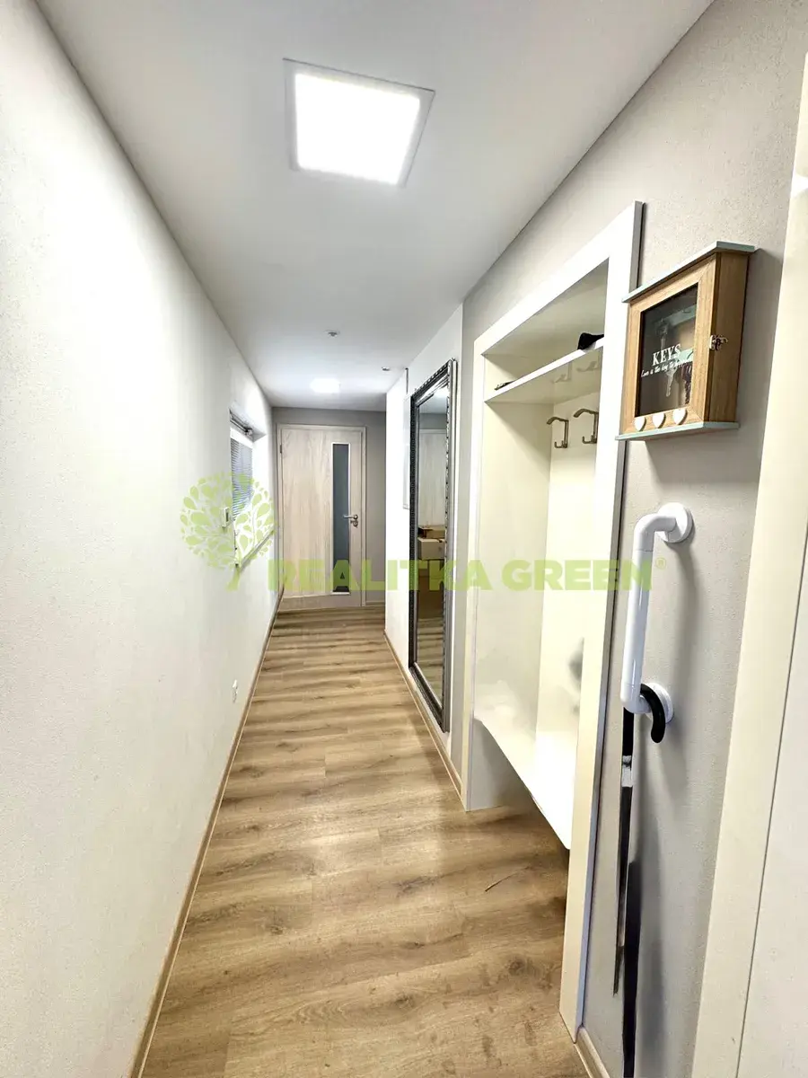 Dispozičně: 1. NP vstupní chodba, technická místnost, ložnice, koupelna s vanou a sprchovým koutem, společná s wc, dětský pokoj, kuchyň s jídelním koutem je propojená s obývacím pokojem a s portálovým vstupem na balkon. Kuchyňská linka je vybavena vestavěnými spotřebiči - myčka, indukční varná deska, horkovzdušná trouba, mikrovlnná trouba, digestoř. V ložnici je umístěna vestavěná skříň.V 1. PP (suterénu) je 3x technická místnost se dvěma samostatnými venkovními dveřmi. Jedna z místností je po rekonstrukci 2024 (vnitřní zateplení stěn i podlahy, nové wc, bojler), kterou lze využít jako společenskou místnost.