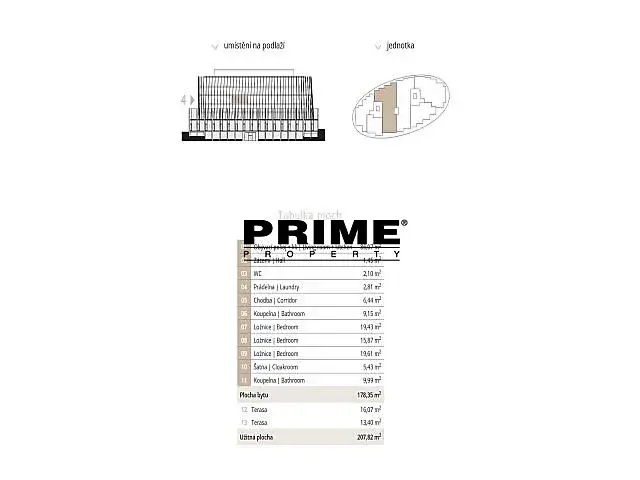 Dispozice bytu: prostorný obývací pokoj (86m2) s jídelní částí, vstupem na terasu (16m2) a s otevřenou, plně vybavenou italskou kuchyní se spotřebiči (indukční varná deska, elektrická trouba, lednice s mrazákem a myčka), hlavní ložnice (20m2) se šatnou a vlastní koupelnou (vana, sprchový kout, umyvadlo, toaleta, bidet), další 2 ložnice (19,5m2 a 16m2), druhá koupelna (vana, sprchový kout, umyvadlo, toaleta, bidet), prádelna a samostatné WC. Druhá terasa (13m2) je přístupná ze všech 3 ložnic a jedné koupelny. Dřevěné podlahy a velkoformátová dlažba. Rekuperace vzduchu, podlahové topení, internet, videotelefon, alarm. K dispozici je sklep.