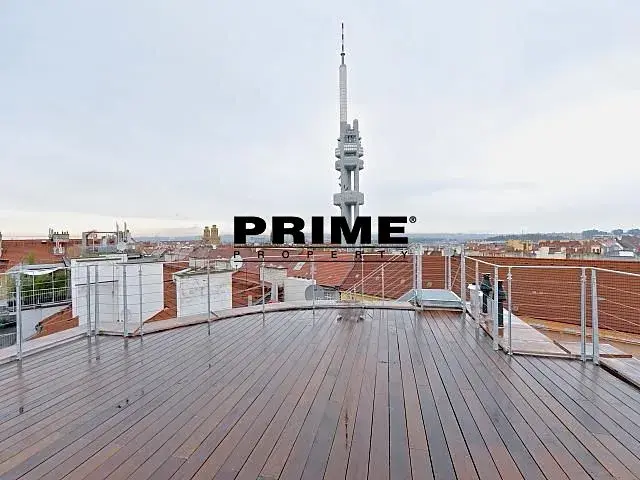 Nájemce neplatí provizi. Exkluzivní, částečně zařízený (nebo po dohodě zařízený), 1 ložnicový, klimatizovaný byt s 1 koupelnou k pronájmu, 2+kk, 60m2, se 2 střešními terasami o výměře 60m2 a 40m2 a s možností garážového stání (za poplatek). Byt je situovaný v 5. patře kompletně zrekonstruovaného secesního domu s výtahem. Budova se nachází na náměstí Jiřího z Poděbrad, v těsné blízkosti stanice metra a zastávky tramvají, blízko obchodů, kaváren a restaurací a nedaleko Riegrových Sadů a obchodního centra Flora.