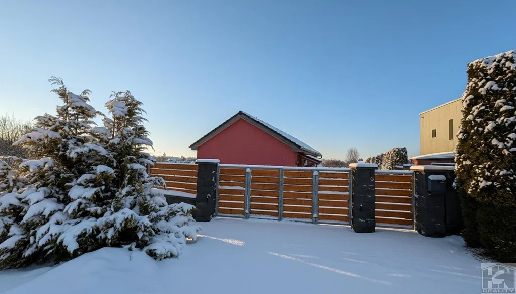Samozřejmostí je parkování na pozemku pro dvě auta a dálkově ovládaná vjezdová brána. Praktickým doplňkem je také dřevěný zahradní domek na nářadí, kola či lyže.