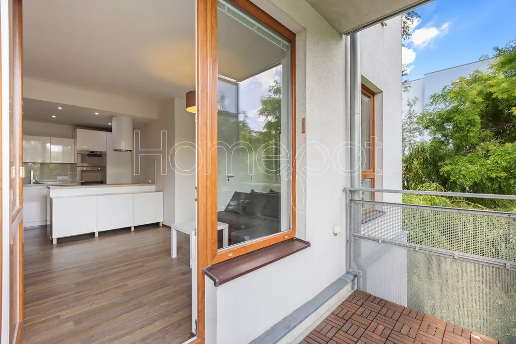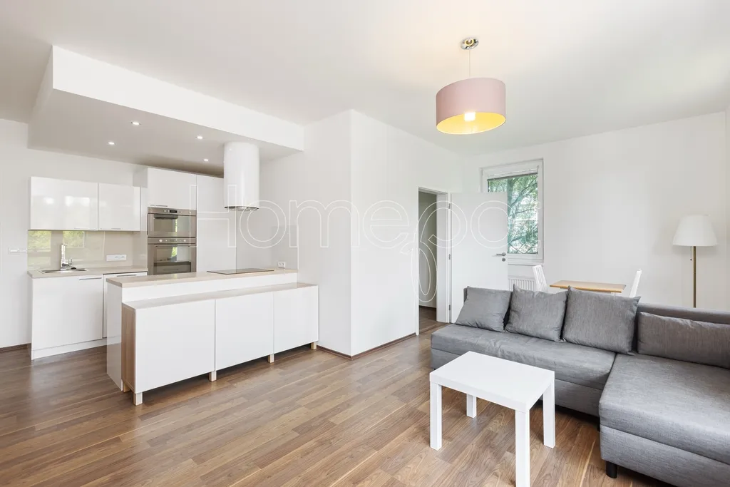 Jedná se o moderní, atraktivní byt, kde byl kladen důraz na dostatek úložného prostoru, praktičnost a vkusný design. Byt se pronajímá vybavený (viz fotografie v inzerci) a sestává z obývacího pokoje s přímým vstupem na balkon a kuchyňské části s plně vybavenou kuchyňskou linkou (myčka, trouba, indukční varná deska, digestoř, mikrovlnná trouba, lednice s mrazákem). Úložné prostory jsou chytře zakomponovány i do jídelního pultu. Balkon s výhledem do zeleně poskytuje příjemné zázemí k odpočinku – třeba u šálku oblíbeného čaje.
