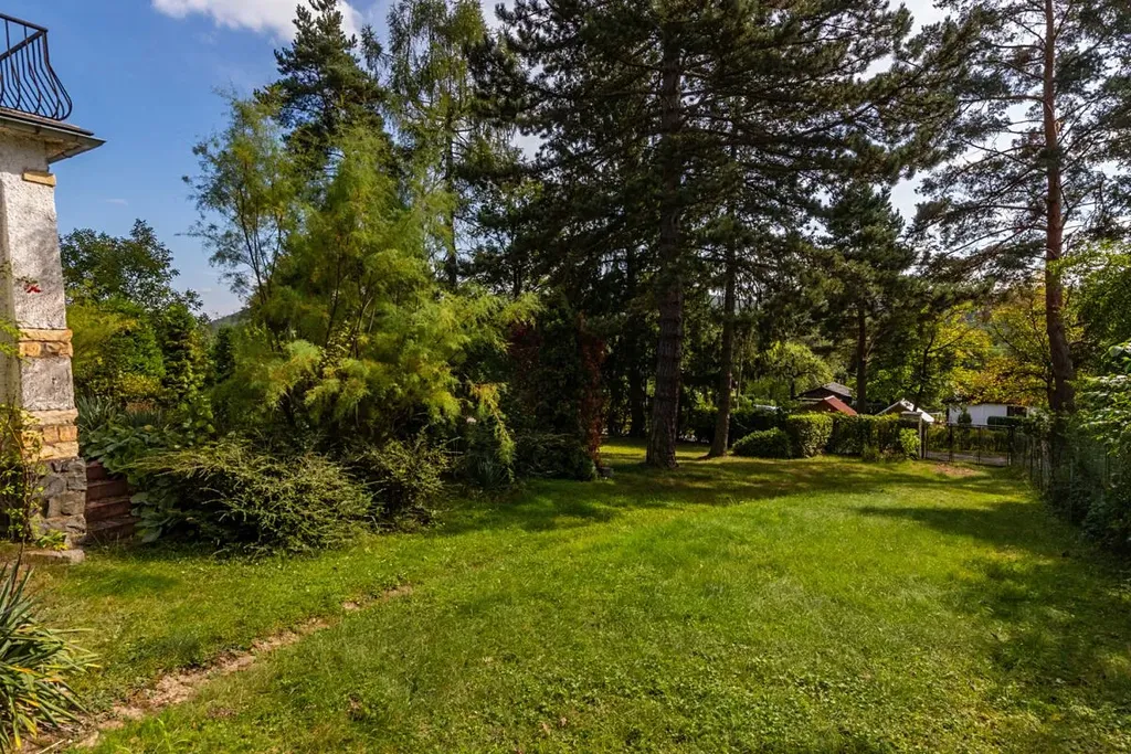 Přilehlá zahrada se vzrostlými stromy a slunnou orientací má pravidelný tvar s výhledem na údolí Sázavy.