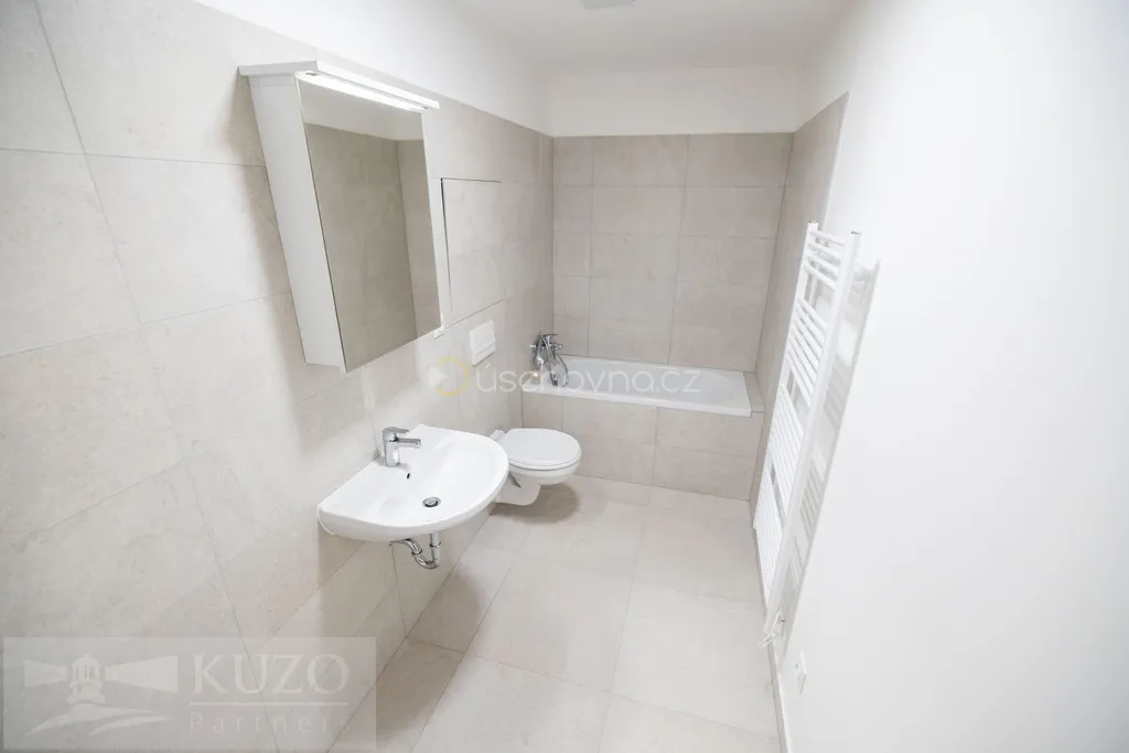 Koupelna je vybavena vanou, toaletou, umyvadlem se zrcadlovou skříňkou, otopným žebříkem a přípojkou na pračku.
