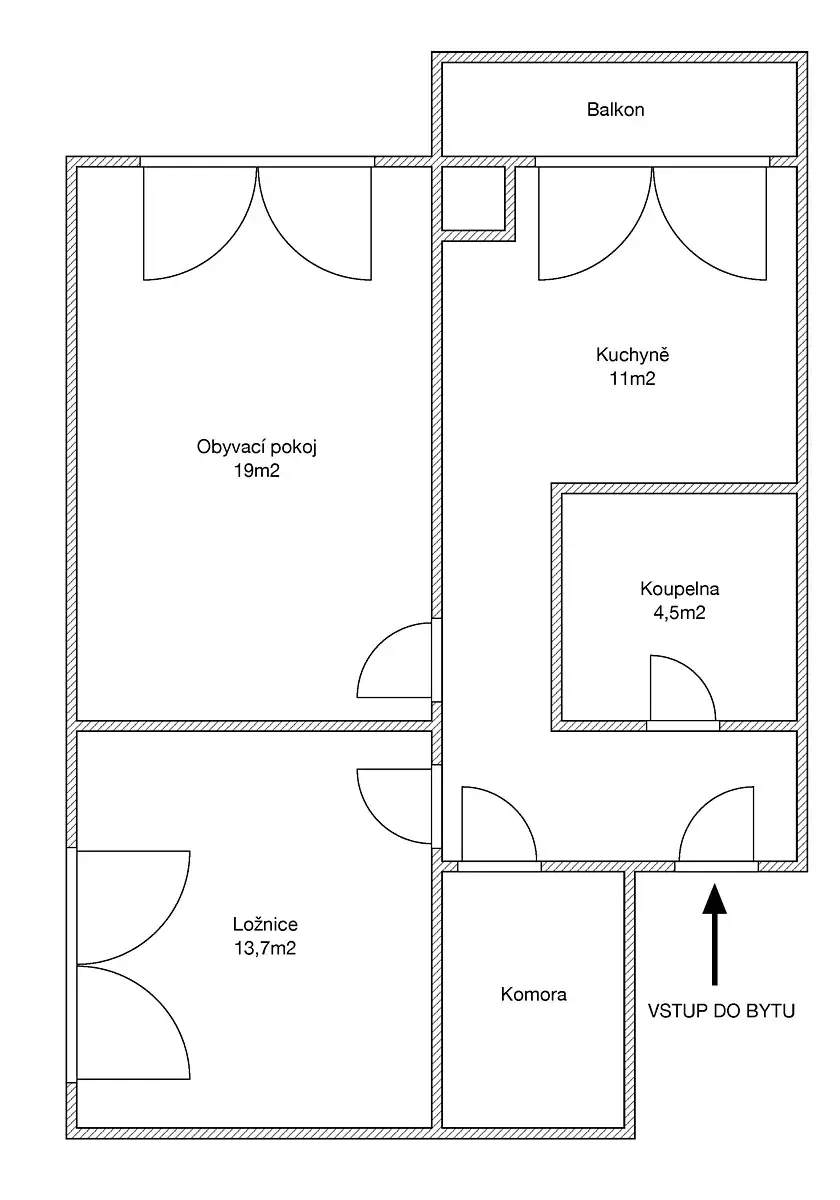 Byt má neprůchozí pokoje a praktickou dispozici. Z prostorné předsíně jsou samostatné vstupy do obou pokojů, kuchyně, koupelny s WC a také do velké komory, která poskytuje nadstandardní úložný prostor. Z kuchyně je přímý vstup na lodžii orientovanou do zeleně, což zajišťuje příjemné soukromí i klidné posezení.