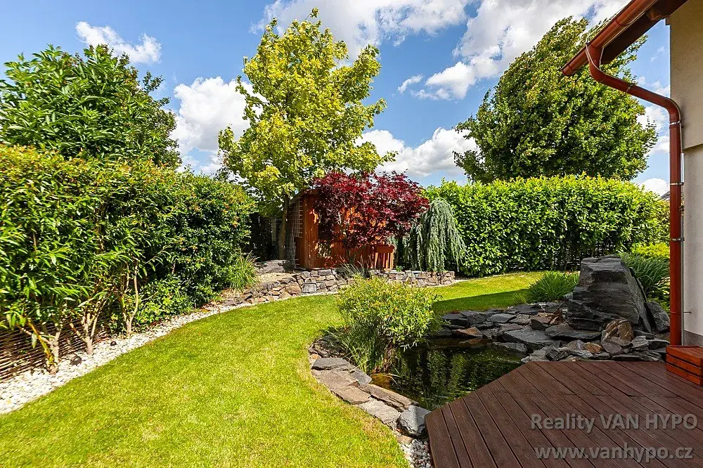 Vybavení zahrnuje, kvalitní vinylové podlahy/plovoucí podlahy, dlažbu a obklady, interiérové dveře CAG, kuchyň včetně vestavěného nábytku citlivě řešeného na míru pro tento byt, k dispozici je také v obývacím pokoji nyní nevyužívaný komín pro instalaci krbových kamen, optický internet aj. Teplo a teplou vodu dodává plynový kondenzační kotel, v koupelně je instalováno el. podlahové topení. Velice příjemná je zahrada se závlahou, která byla navržena zahradním architektem a nabízí klidné posezení, místo na hry a odpočinek u zahradního jezírka.