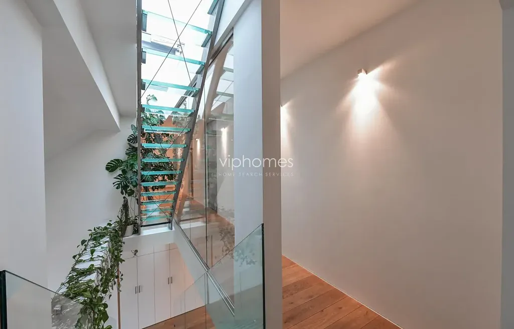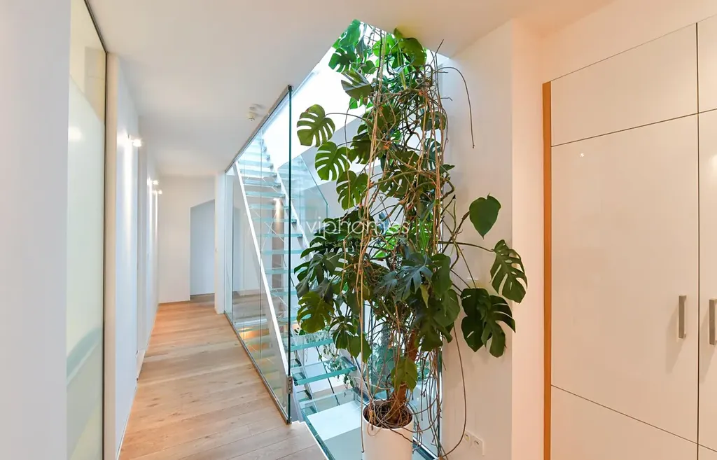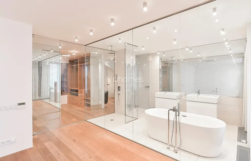 Velký ( 100 m2) přízemní otevřený prostor nabízí obývací pokoj moderně propojený s kuchyňskou linkou, a jídelnu ze vstupem na terasu. Vzdušná kuchyně je vybavena všemi potřebnými spotřebiči (Miele), kombinovaná varná deska, parní trouba, myčka nádobí, lednice s mrazákem. Dominantním prvkem interiéru je závěsný krb v zábavné části obývacího prostoru. Plynový krb je funkčním a zároveň klíčovým dekorativním prvkem, jenž v obytném prostoru vytváří přívětivou atmosféru. V patře je umístěna hlavní ložnice s vlastní koupelnou a velkou vybavenou šatnou, další dvě ložnice ze společnou koupelnou a prostorná galerie. Dvě ložnice mají přístup na velkou terasu s vířivkou. Ve třetím patře byt disponuje nádhernou střešní terasou s okouzlujícími výhledy na panorama Prahy. Interiér je dílem renomovaného architektonického studia Donlic.