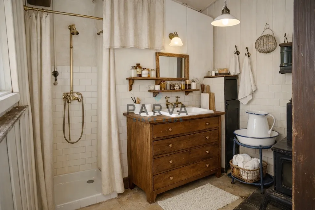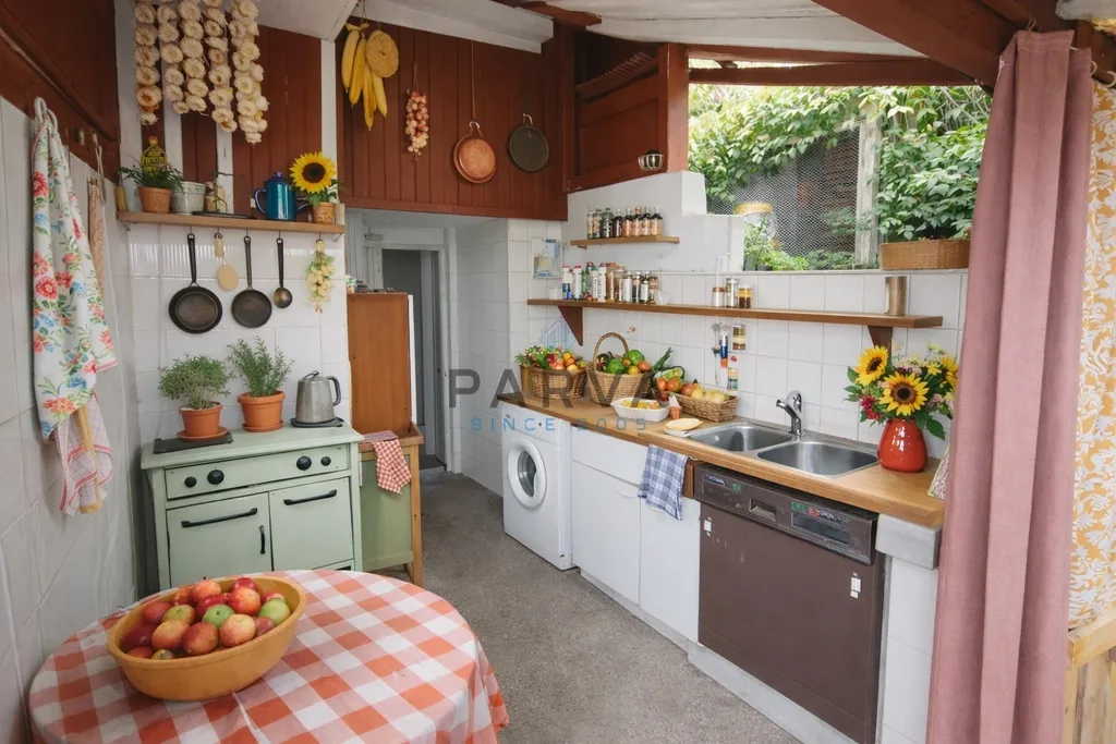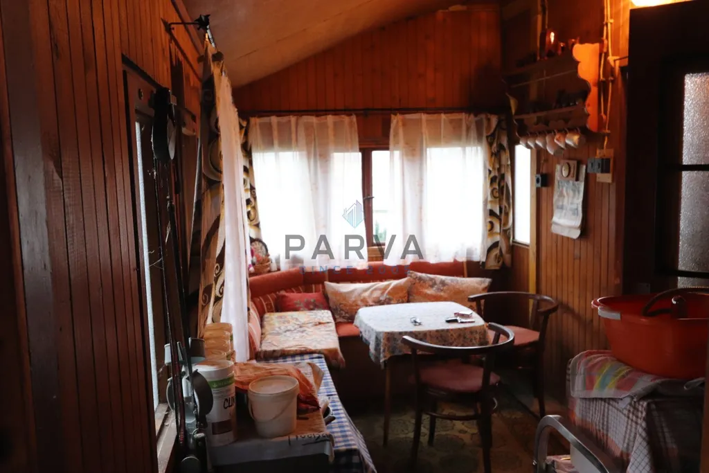 U hlavních dveří za verandou po levé straně je přírodní sprchový kout s umyvadlem a bojlerem na ohřev vody. Po pravé straně letní kuchyň se sporákem s myčkou a pračkou. Za letní kuchyní je napojena kolna na nářadí na lednici a mrazák. WC je zděný od chaty oddělen.