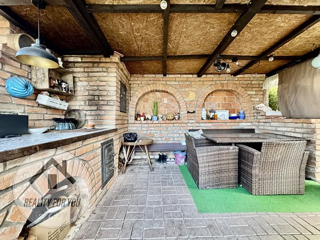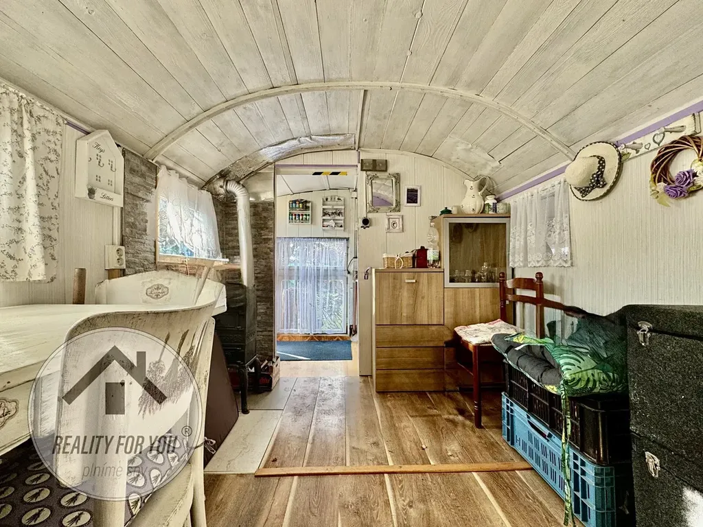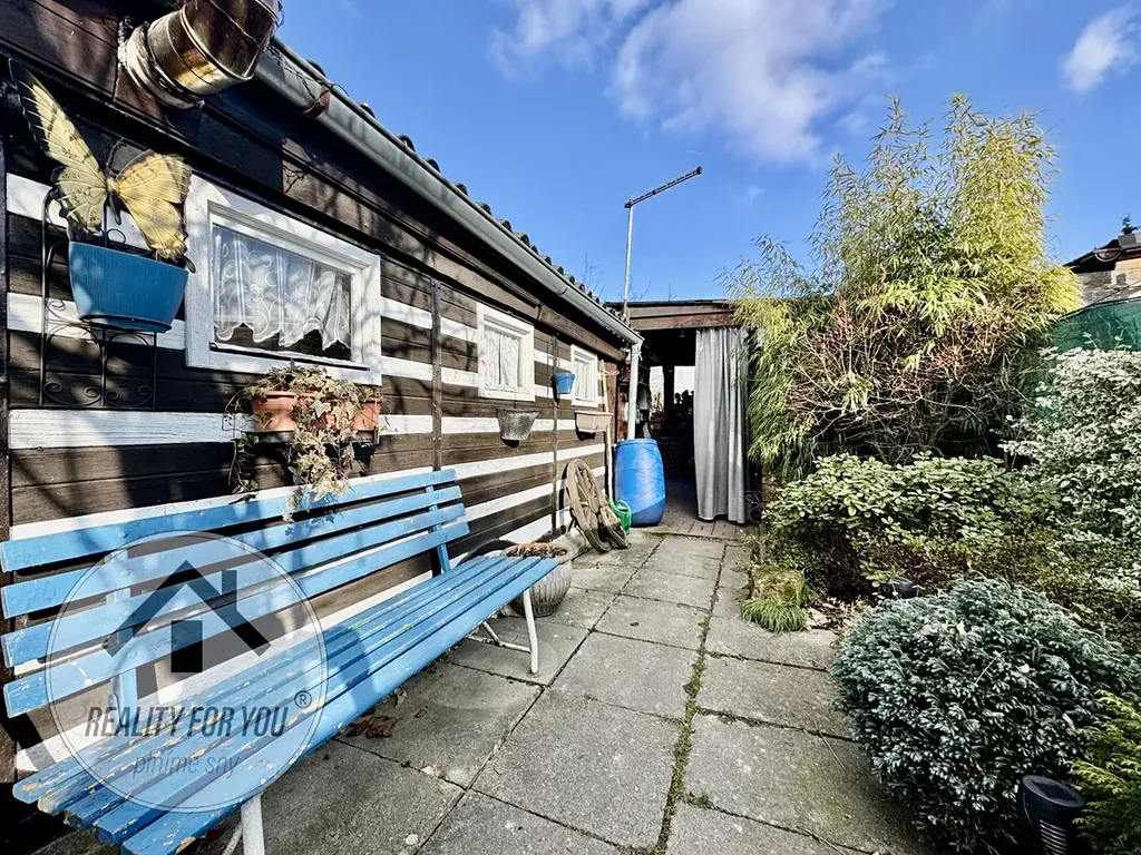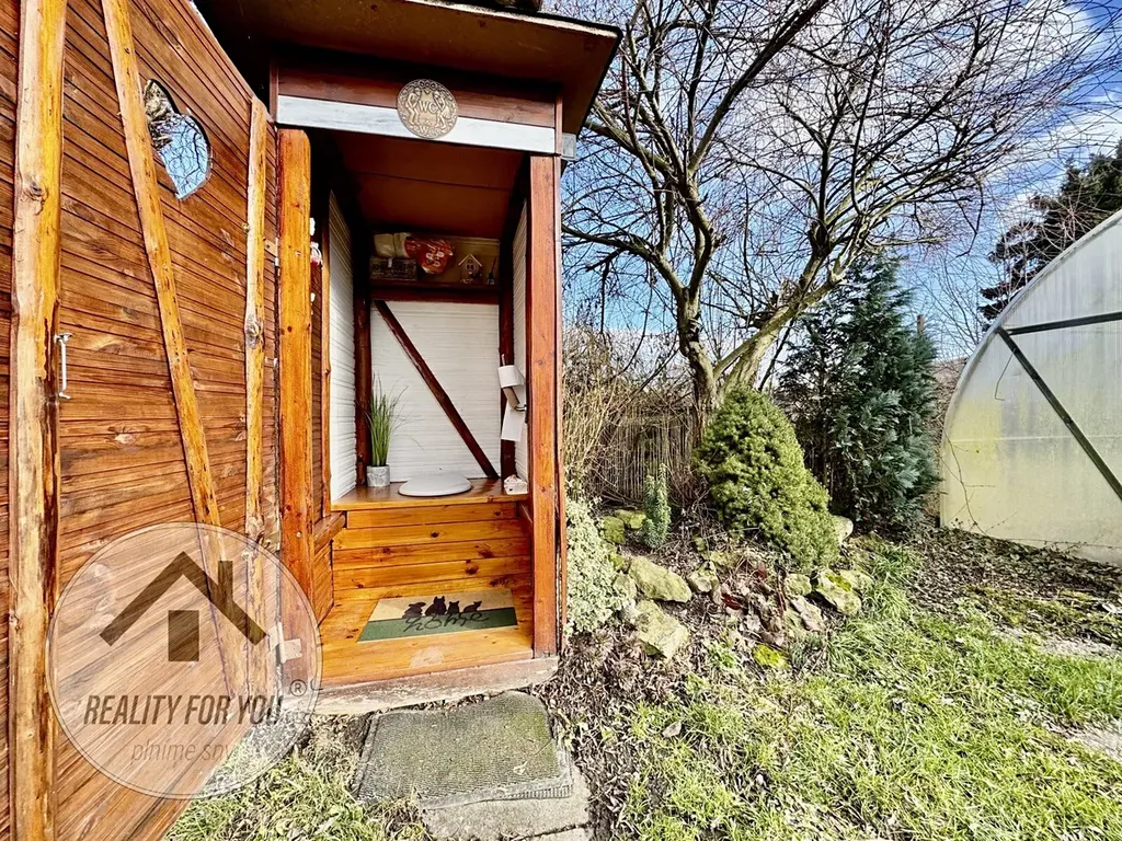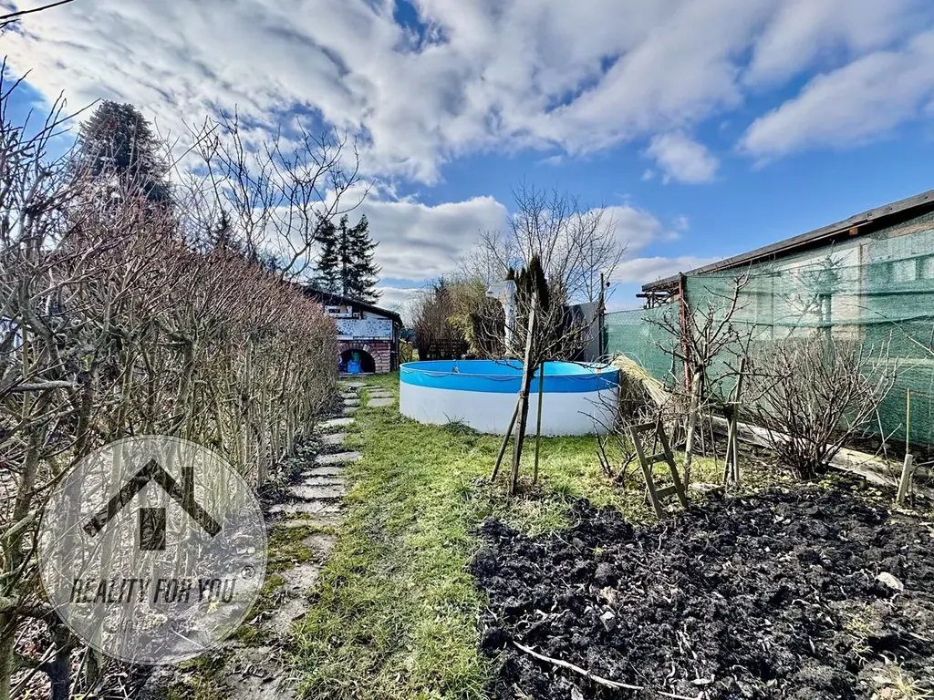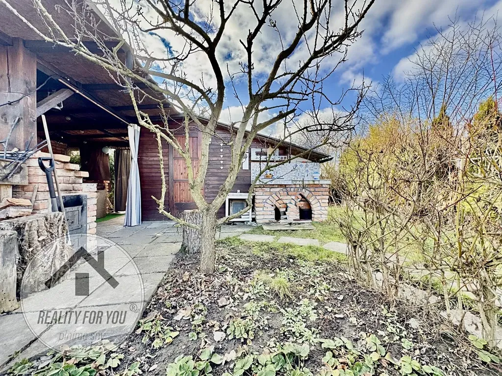 Zahrádka o výměře ca. 360 m2 je rovinatá a kompletně oplocena. Uprostřed pozemku je umístěna chatka, která původně vznikla z vagónu. Stavba chatky je ve velmi dobrém technickém stavu a nabízí obývací pokoj s možností přespání, menší kuchyňku a sklípek. V centrální části zahrady je velká terasa s černou venkovní kuchyní - ideální pro grilovačky, posezení s přáteli a rodinou či k relaxaci. V zadní části stavby je technika část (sklad) o výměře cca 10 m2.