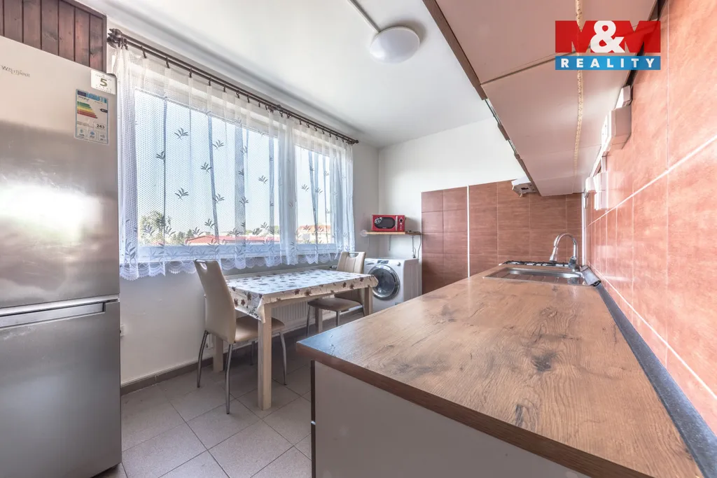 Na fotografiích je zařízení současného nájemníka, po odstěhování bude v bytě rohová pohovka bez skříněk, šatní skříň v ložnici, kuchyňská linka se sporákem a pračka. Malý pokoj bude prázdný.