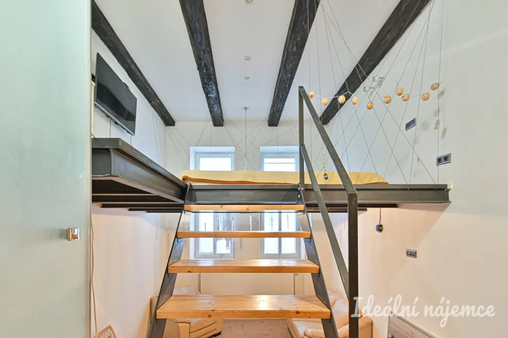 Součástí bytu je obytný pokoj s patrem na spaní, samostatná kuchyně a koupelna se sprchovým koutem a toaletou. Kuchyň je vybavena kuchyňskou linkou se spotřebiči. Byt se nabízí vybavený dle fotografií.