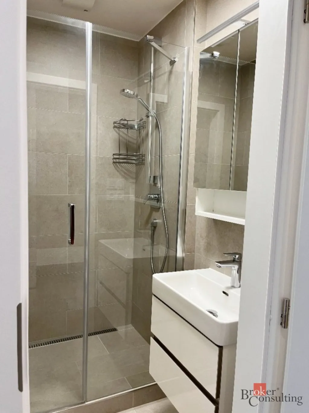 Byt nabízí obývací pokoj s kuchyňským koutem, samostatnou ložnici, koupelnu se sprchovým koutem, samostatné WC, předsíň s vestavěnými skříněmi a komoru na chodbě přímo před bytem. Kuchyňská linka je vybavena varnou deskou, troubou, digestoří, pračkou a lednicí s mrazákem.