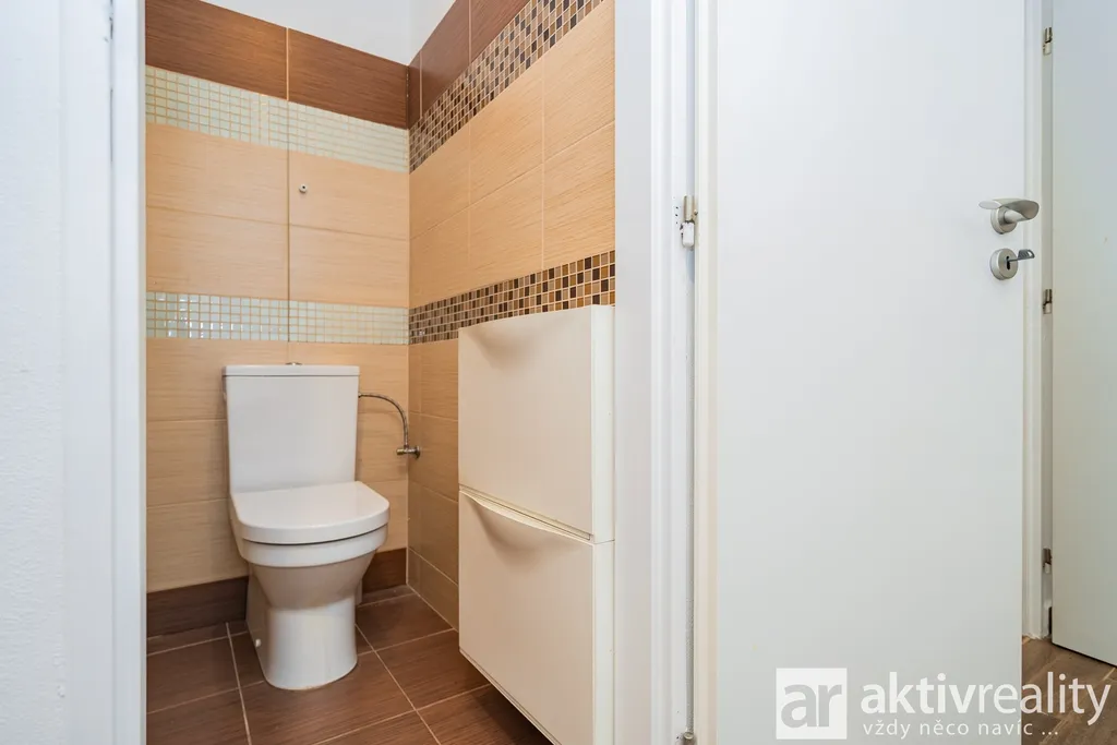 Dále je ložnice a dětský pokoj. Oba pokoje působí světlým a vzdušným dojmem. Koupelna s vanou, toaleta je samostatná.