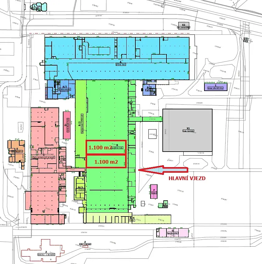 ◉ 2.200 m2 – oplocená 2x skladová plocha 1.100 m2 na hale