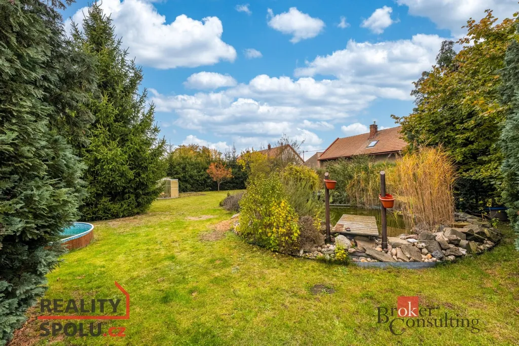 Zahrada je rovinatá, slunná a velmi prostorná, se vzrostlou zelení, jezírkem a skleníkem. Nabízí ideální místo pro odpočinek, dětské hry i zahradničení.
