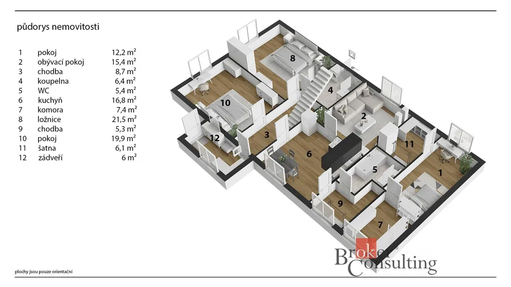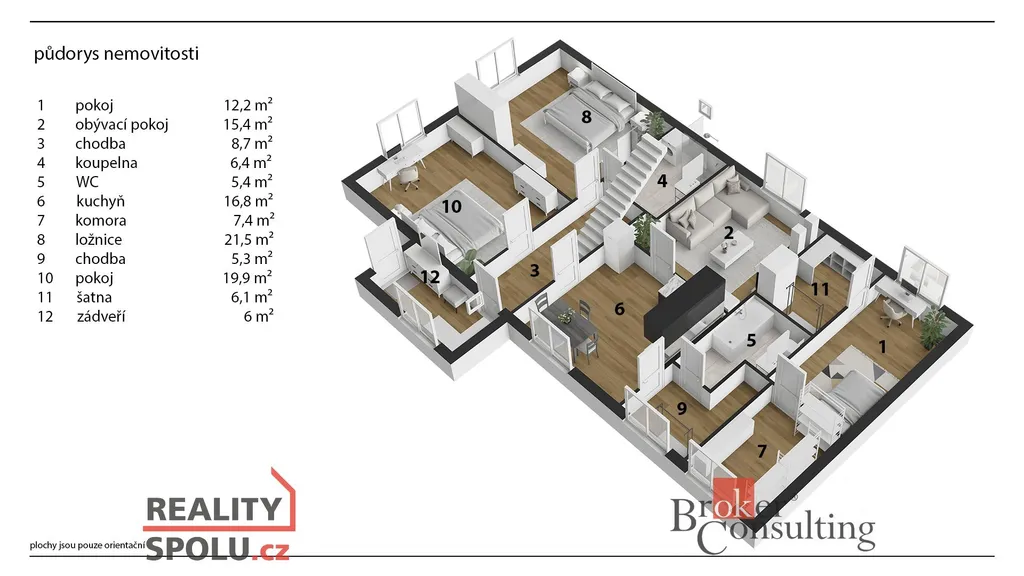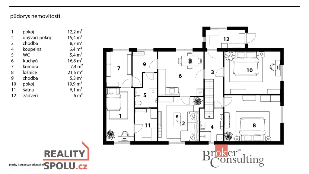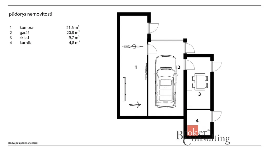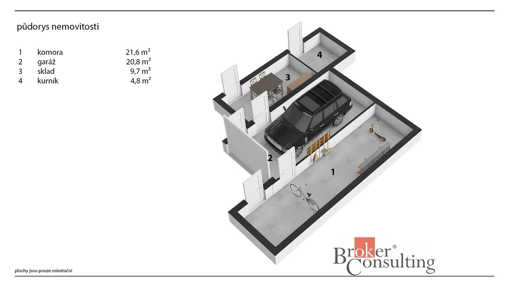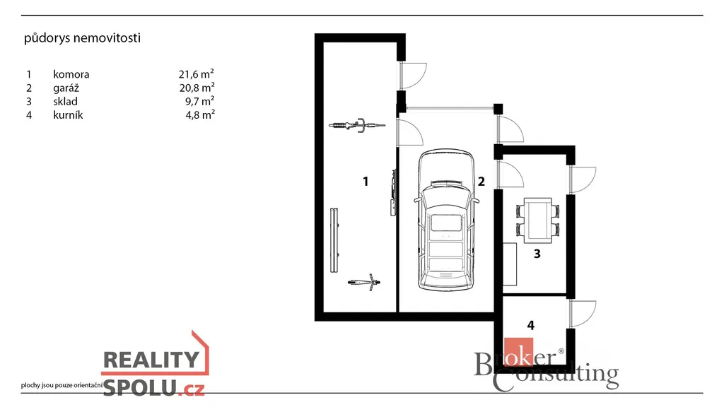 Součástí domu je také garáž o výměře 20,8 m², sklad 9,7 m² a další komora 21,6 m², které poskytují dostatek úložných prostor.