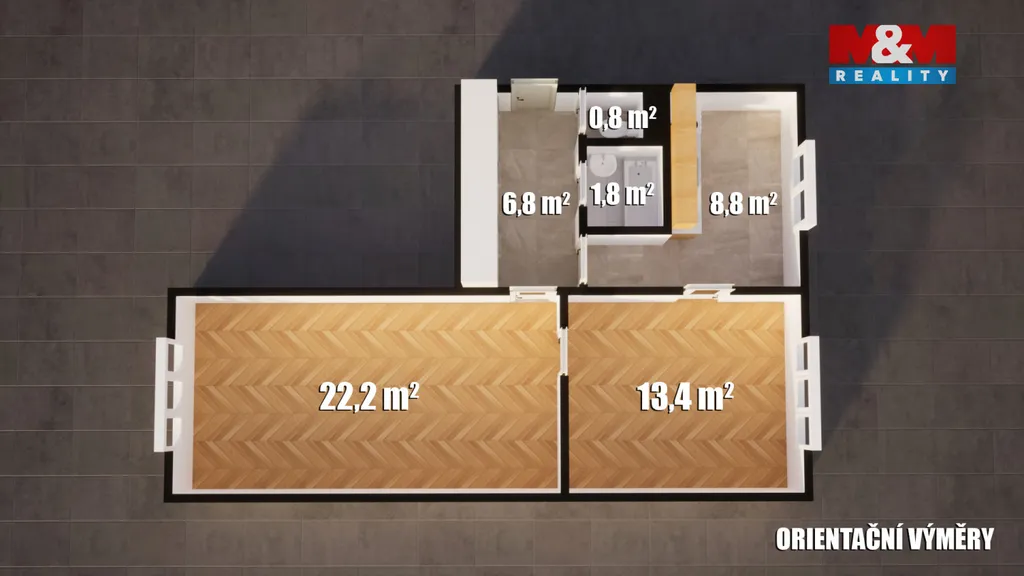 Byt 2+1 o ploše cca 55 m² ve 2. nadzemní podlaží domu, výtah do mezipatra. Dispozice nabízí prostorný obývací pokoj 22 m², samostatnou ložnici, oddělenou kuchyň, koupelnu a WC. Stav je původní, udržovaný – ideální základ pro rekonstrukci podle vlastních představ. Plastová okna s parapety, zachovalé parkety, sklepní kóje. Tento půdorys umožní byt modernizovat bez zásadních stavebních zásahů.