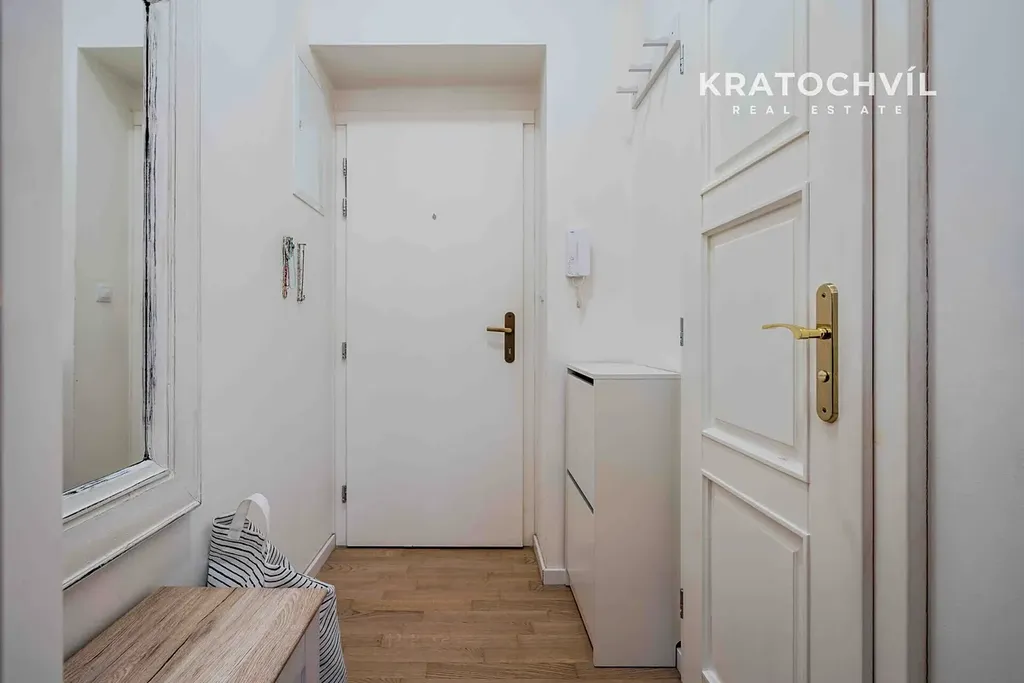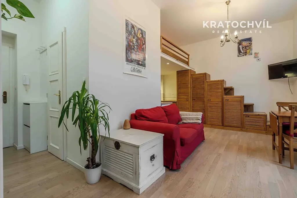 Hlavní výhodou tohoto bytu jsou vyšší stropy a vestavěné patro na spaní, což zvětší plochu bytu. V koupelně je sprchový kout, místo pro pračku se sušičkou, na podlaze jsou plovoucí podlahy a dlažba.