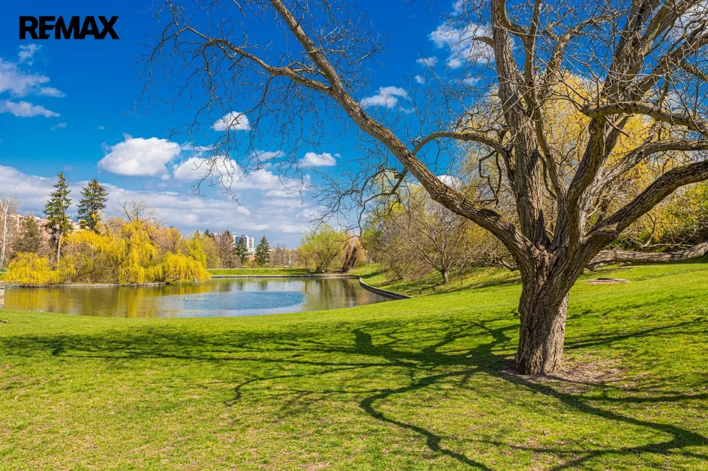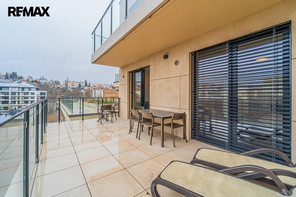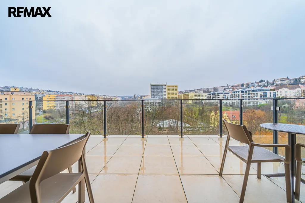 Z obývacího pokoje i ložnice je přes panoramatická posuvná okna přímý vstup na terasu o ploše cca 24 m² (7 × 3,5 m), která nabízí nádherný výhled na park Kajetánka, vilu Kajetánka, budovu oranžerie a také na osvětlené areály Břevnovského a Strahovského kláštera.
