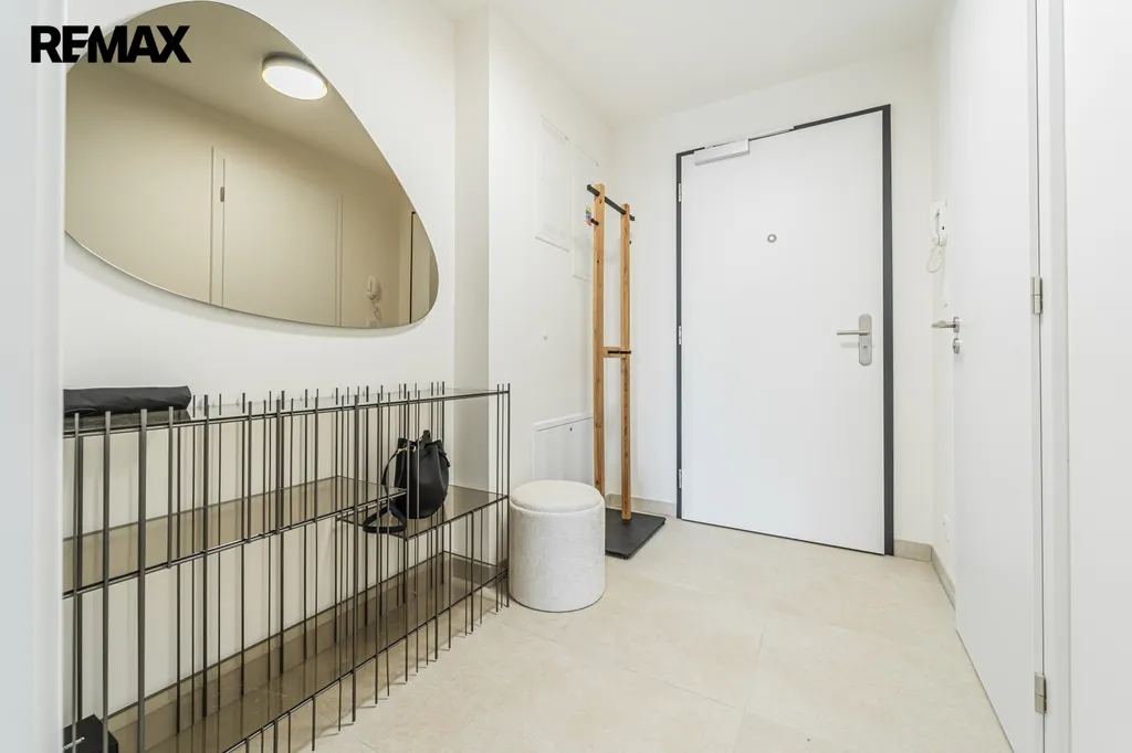 Byt nabízí prostorný obývací pokoj pravidelného tvaru s plně vybaveným kuchyňským koutem, jehož dominantou je pracovní deska z přírodního kamene. Součástí obývací zóny je také samostatná toaleta pro hosty.