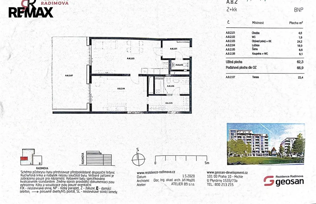 Byt se nachází v 8. patře nového exkluzivního domu Rezidence Radimova. Jedná se o jediný byt této dispozice 2+kk v celém projektu, situovaný v nejvyšších podlažích určených pro penthousy (8.–9. patro).