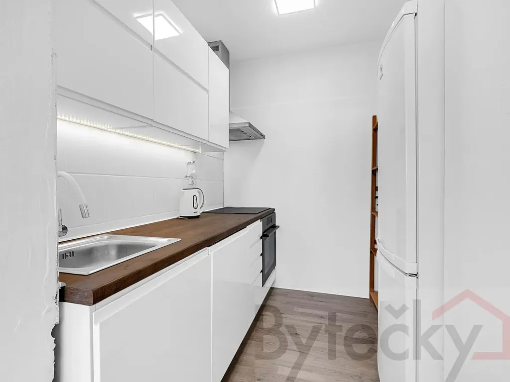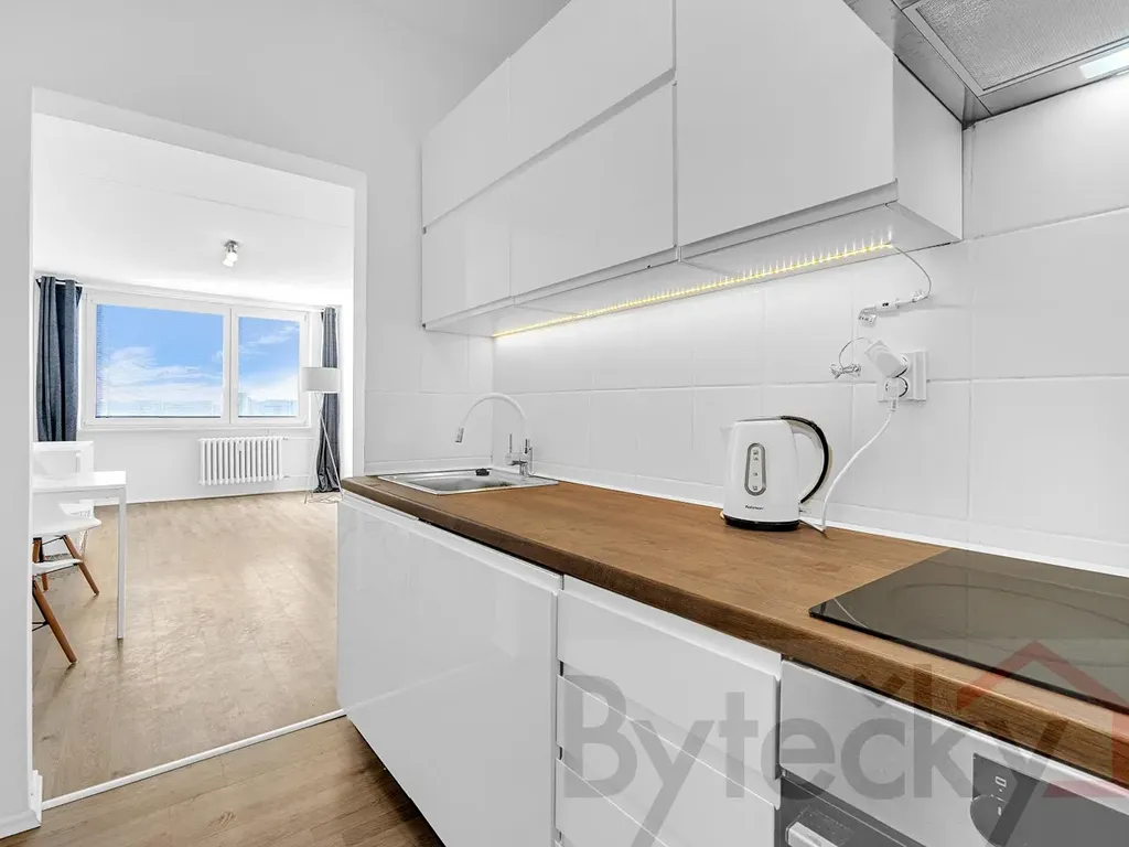 Nabízíme k pronájmu částečně zařízený panelový byt 2+kk v ulici K lukám, Praha 4 Libuš. Bytová jednotka je v 5. posledním patře s výtahem. Byt je po rekonstrukci, zděné jádro s vanou, samostatná toaleta, nová kuchyňská linka, myčka, lednička a elektrická sklokeramická varná deska + trouba. V koupelně je pračka s vrchním vkládáním prádla. V bytové jednotce šatní skříně a v ložnici je manželská postel bez matrace. Orientace oken na jednu světovou stranu - severozápad a je krásný výhled. Rozměry: předsíň 7,26m2; koupelna 2,20m2; toaleta 2,19m2; obývací pokoj s kuchyňským koutem bez okna 22,94 m2; ložnice 11,70 m2. Celkem podlahová plocha 46,29 + sklep 5,40 m2 = celkem 51,69m2