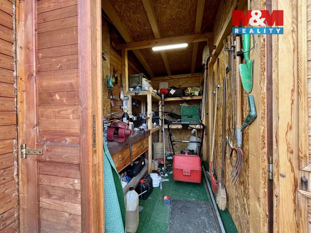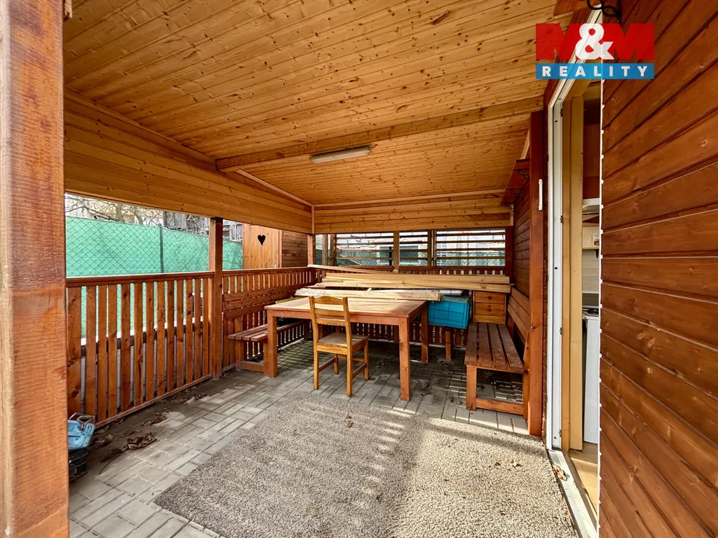 Na chatku navazuje z venkovní strany praktická dílna/technická místnost na nářadí a zahradní potřeby. Z obytné části je přímý vstup na prostornou pergolu, která je ideálním místem pro grilování a letní posezení. Na zahradě je také vybudovaný suchý záchod.