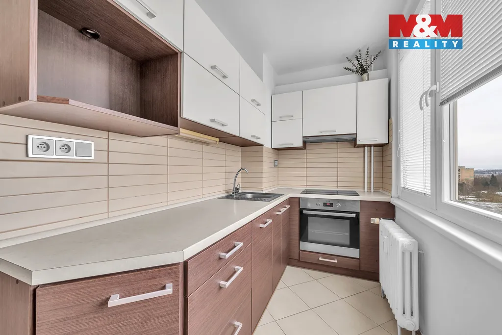 Interiér bytu je zařízen kuchyňskou linkou vybavenou varnou deskou, elektrickým sporákem, digestoří a vestavěnou skříní v předsíni.