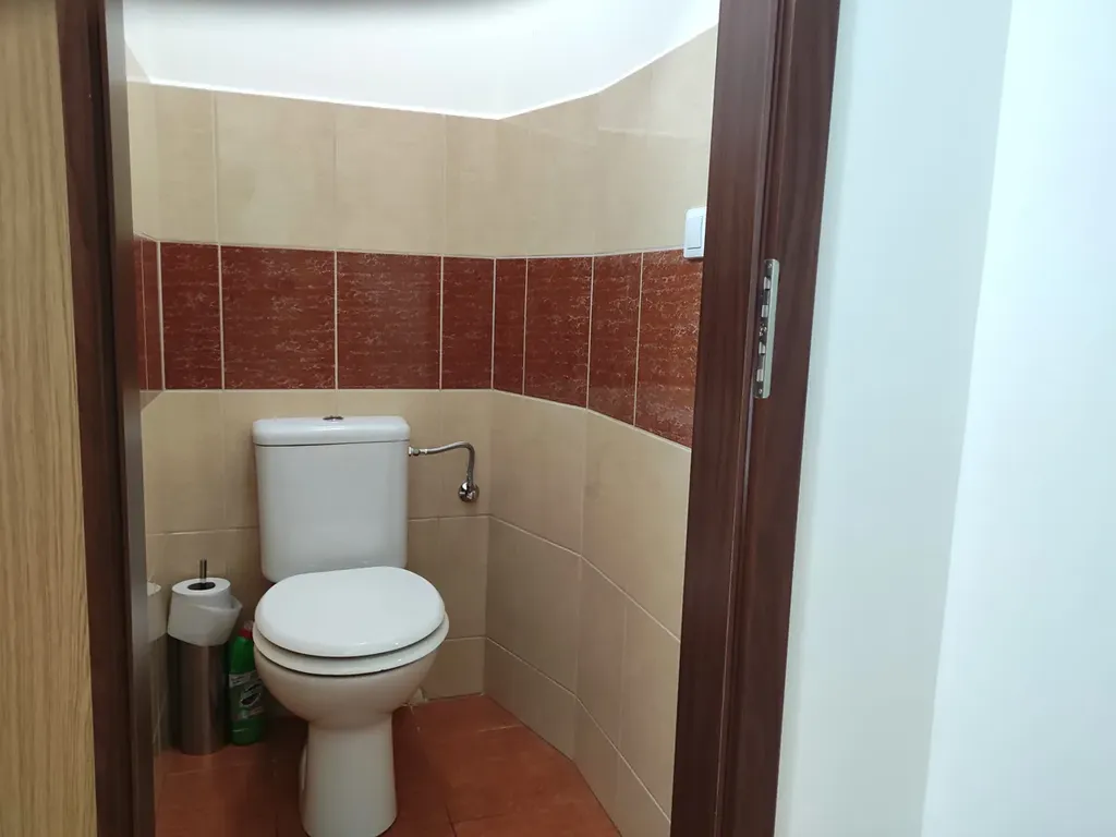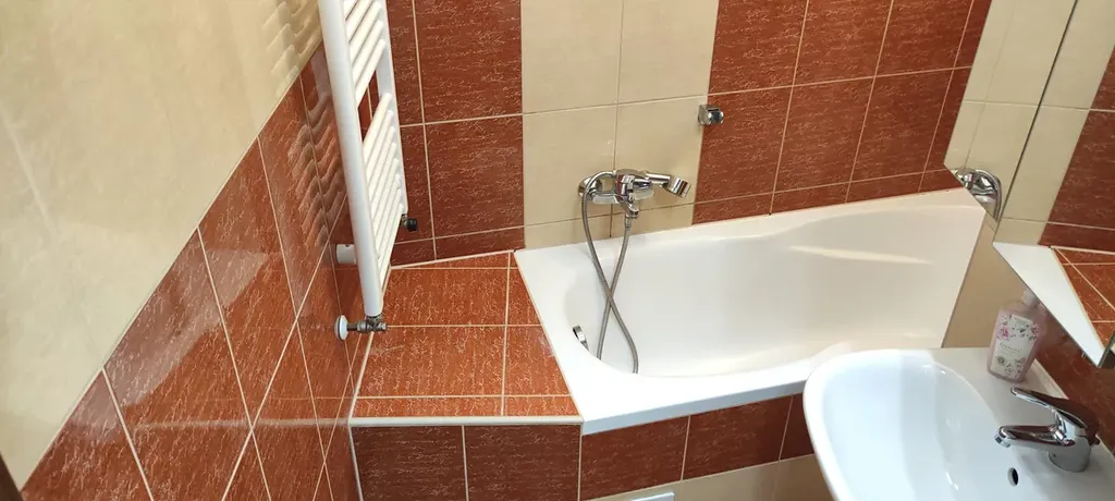 V místnostech jsou radiátory, na podlaze je dlažba nebo plovoucí podlaha.