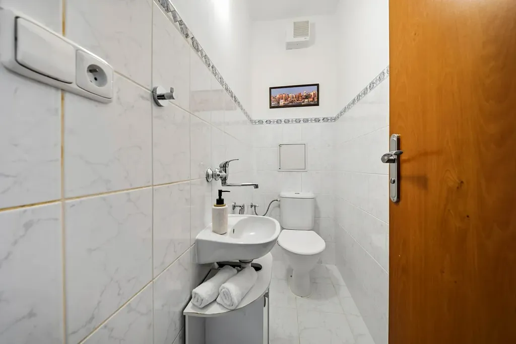 Z prostorné předsíně je vstup do obývacího pokoje s kuchyňským koutem, dětského pokoje, koupelny s vanou, samostatného WC a komory